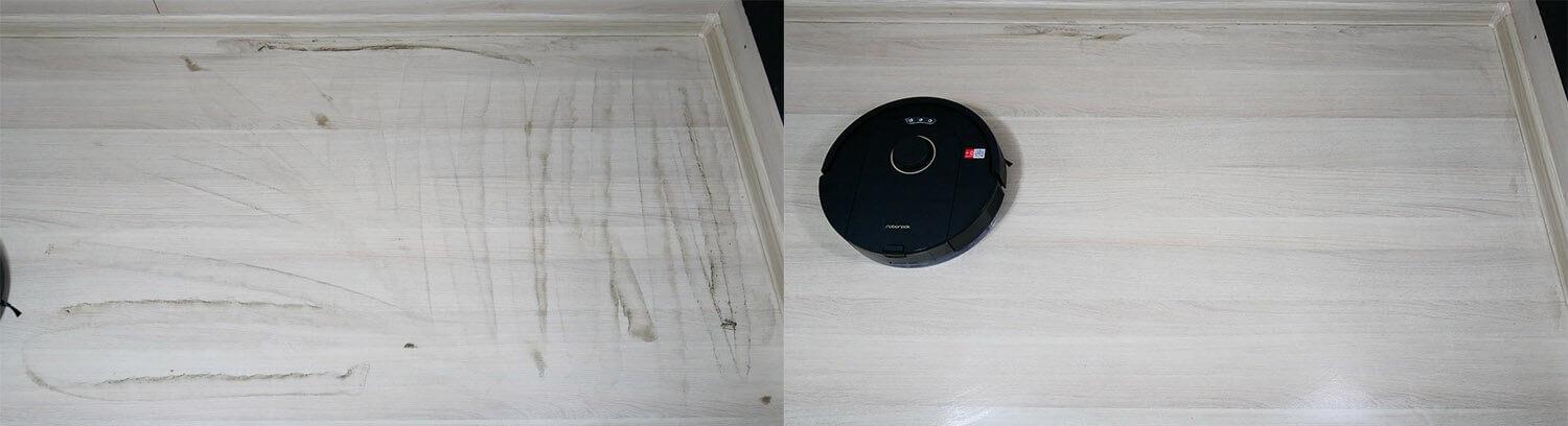 Nešvarumų šalinimo našumas taip pat vidutinis. Šluostė tvirtai prispaudžiama prie grindų ir sugeria nešvarumus. Dėl to lieka tik siaura, neplauta vieta palei grindjuostę, kuri yra beveik visų apžvelgtų robotų dulkių siurblių silpnoji vieta. „Roborock Q5 Pro Plus“ atveju ši vieta yra maždaug 32 mm pločio.