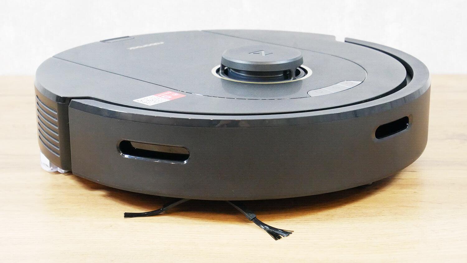 Pažvelkime į „Roborock Q5 Pro Plus“ dizainą. Pradėkime nuo paties roboto dulkių siurblio. Jis apvalus ir juodos spalvos. Minkštas mechaninis bamperis turi sienos jutiklį ir kliūčių aptikimo jutiklį. Roboto korpusas yra 97 mm aukštyje nuo grindų.
