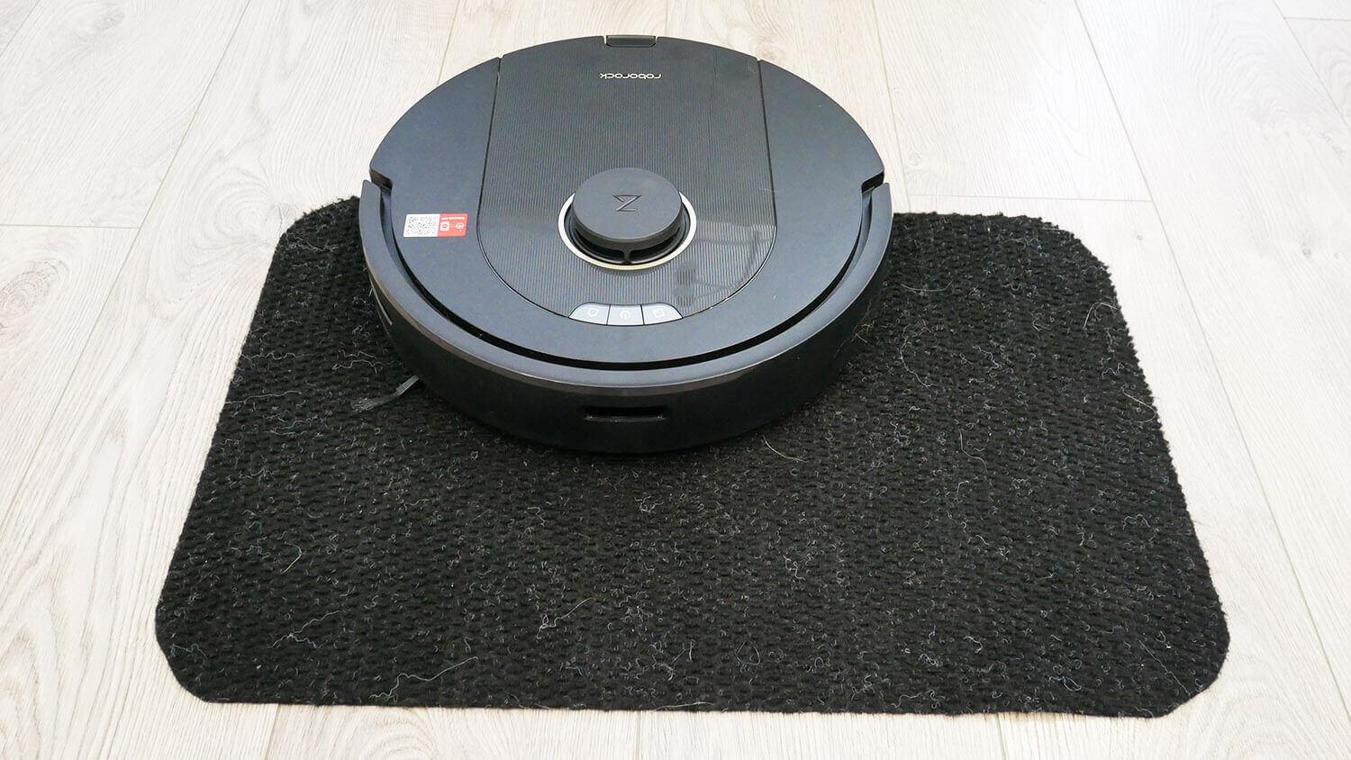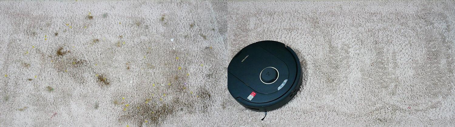 „Roborock Q5 Pro Plus“ taip pat gerai valo kilimus. Verta paminėti, kad silikoniniai turbo šepečiai šiek tiek prastesni už įprastus šerelių formos šepečius dulkių surinkimo nuo kilimų atžvilgiu, tačiau valymo našumas namų aplinkoje vis tiek yra aukštas. Testas išlaikytas!