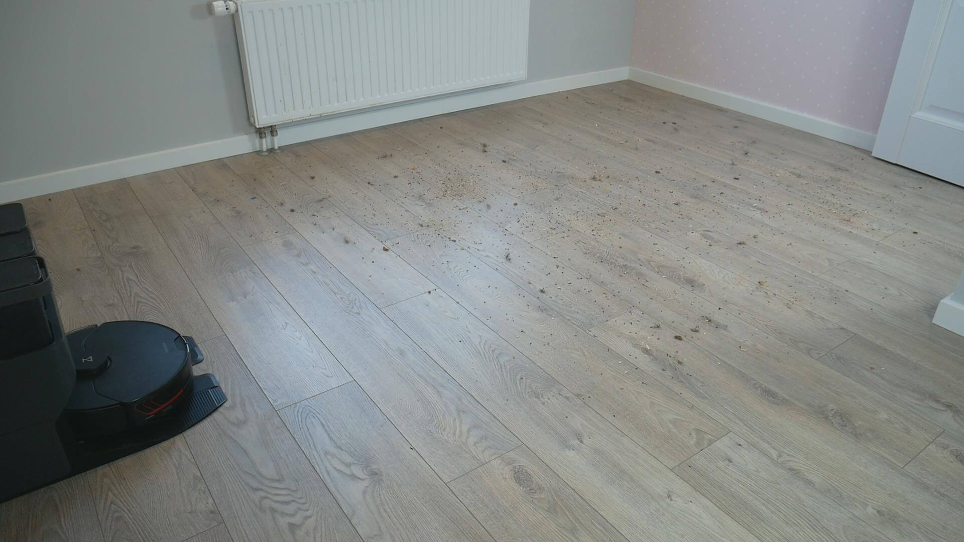 Šis bandymas pademonstruos „Roborock S7 MaxV Ultra“ savaiminio valymo našumą. Šio bandymo metu ant grindų buvo išbarstytos įvairios šiukšlės. Robotas jas surinko ir puikiai išvalė.