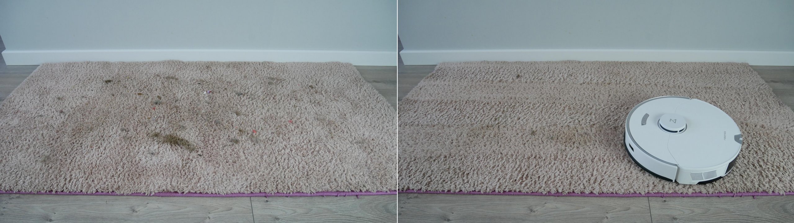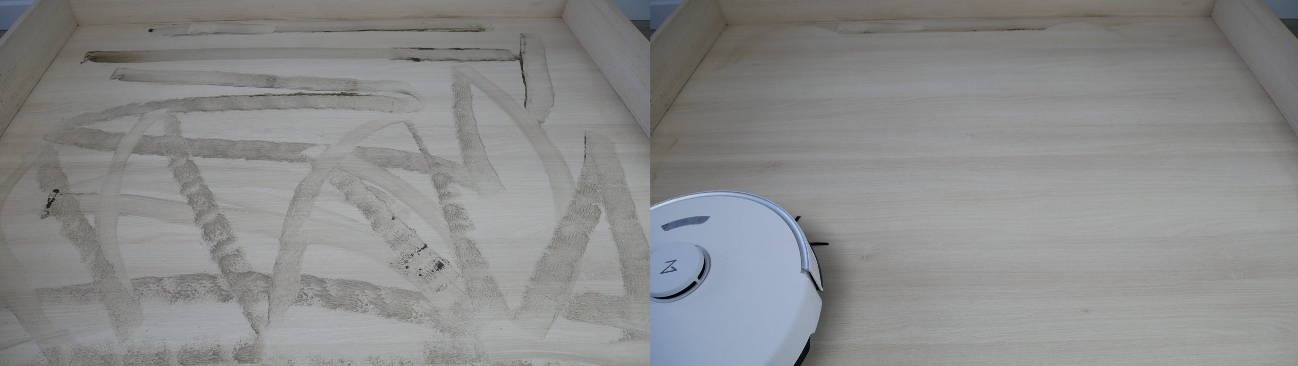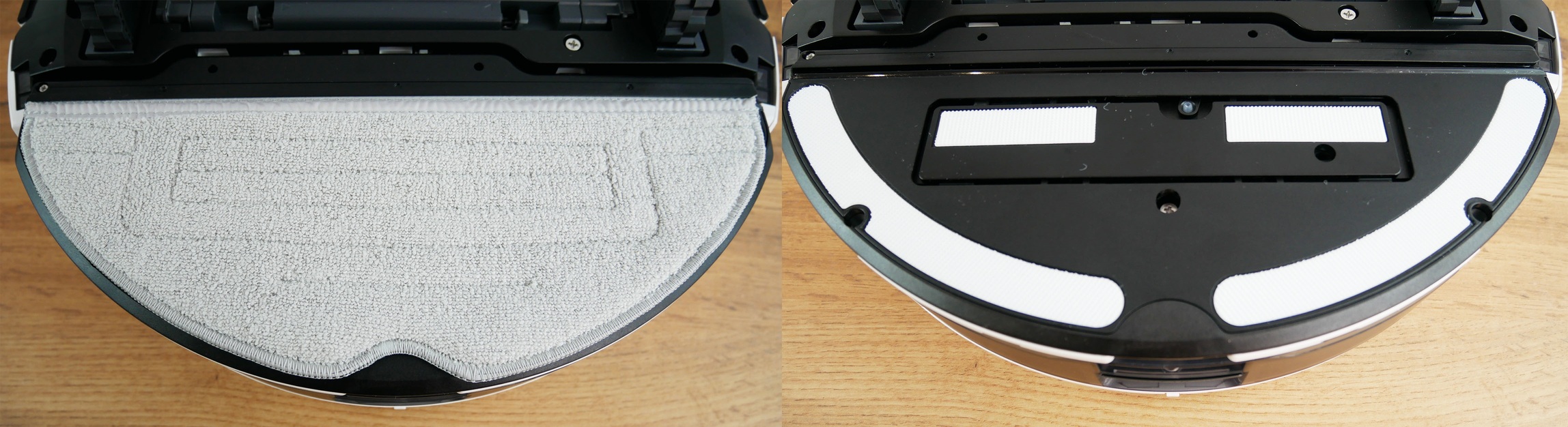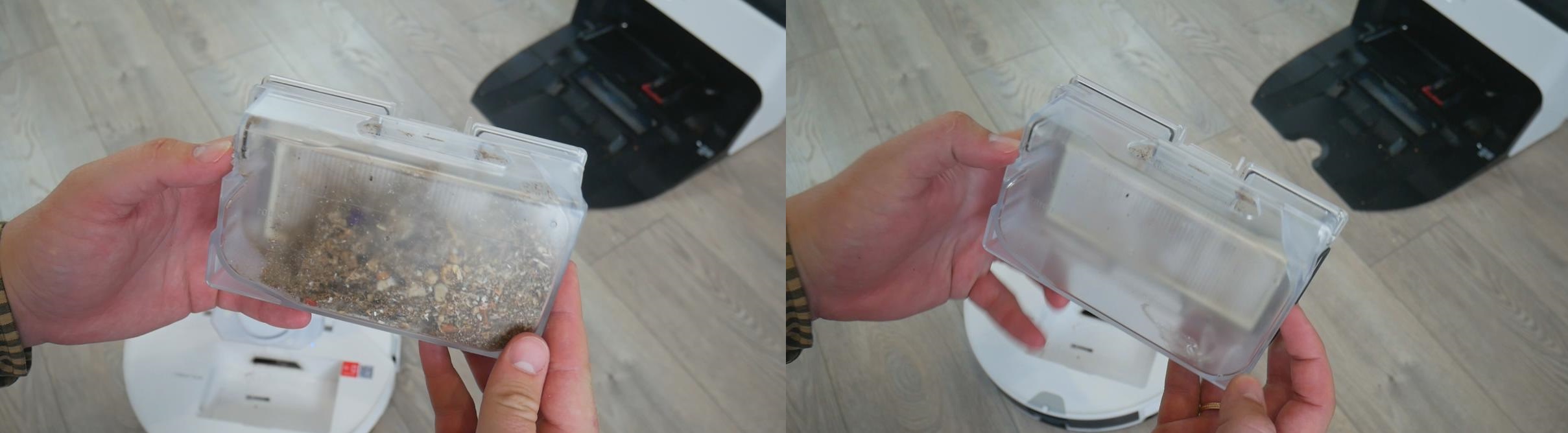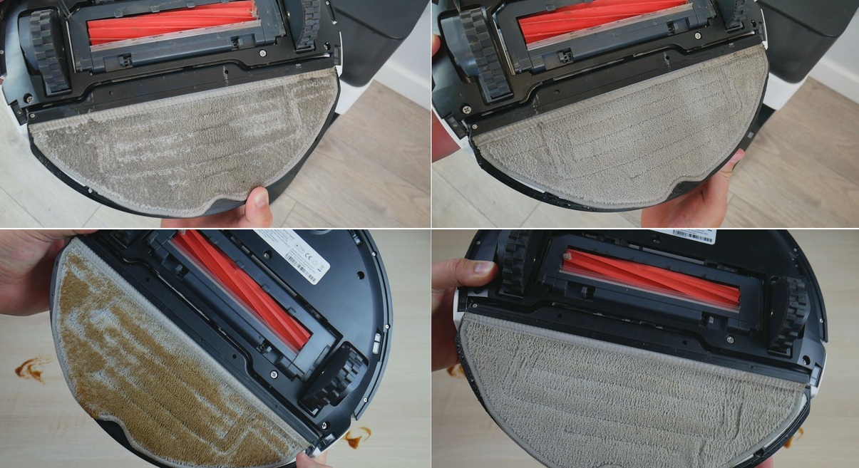 Šluostės skalavimo kokybė yra aukšta, bent jau tokia pati kaip ir panašių gaminių. Pateikiame ankstesnių bandymų rezultatus: šluostės būklė po stovo valymo ir po skalavimo stotelėje. Taip pat dar kartą patikrinsiu šluostės būklę išvalęs kambarį su nešvariomis grindimis. Galite matyti būklę prieš ir po skalavimo. Šiuo atžvilgiu robotas neturi jokių nusiskundimų.
