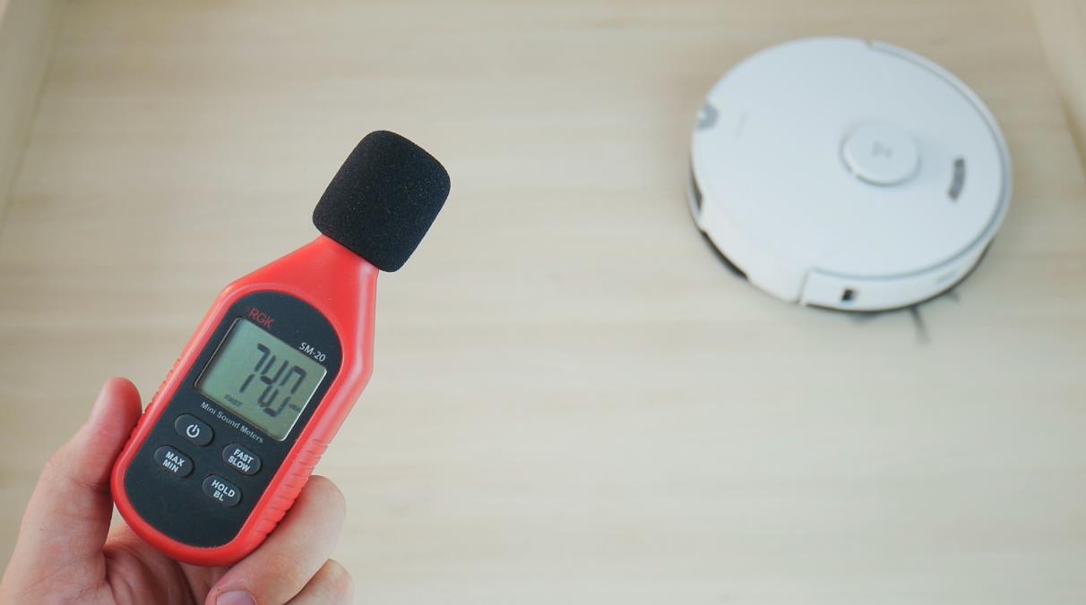 Galiausiai išmatavome „Roborock S7 Pro Ultra“ triukšmo lygį skirtingais režimais. Išjungus siurbimą, triukšmo lygis neviršija 59 dB. Esant minimaliai galiai, triukšmo lygis svyruoja nuo 61 iki 63 dB. Esant vidutinei galiai, jis pakyla iki 64–65 dB. Turbo režimu triukšmo lygis yra apie 66–68 dB, o esant maksimaliai galiai, pikas siekė 75 dB. Atsižvelgiant į didelę siurbimo galią, šio roboto triukšmo lygis yra gana priimtinas.