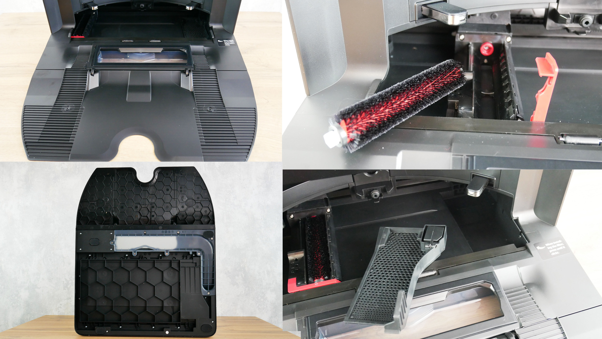 Roboto įėjimo platforma turi siurbimo kanalą. Atliekos iš roboto išleidžiamos į maišą per centrinį šepečių bloką. Įkrovimo gnybtai yra gale. Pačioje platformoje yra nuimamas pūkelių šepetėlis valymo šluostei valyti. Deja, pati platforma nėra nuimama. Nuimamas tik šiurkštus filtras. Taip pat svarbu atkreipti dėmesį, kad centre yra antgalis roboto bakui pripildyti. Skalaujant valymo šluostę, robotas papildo savo baką – labai patogu!