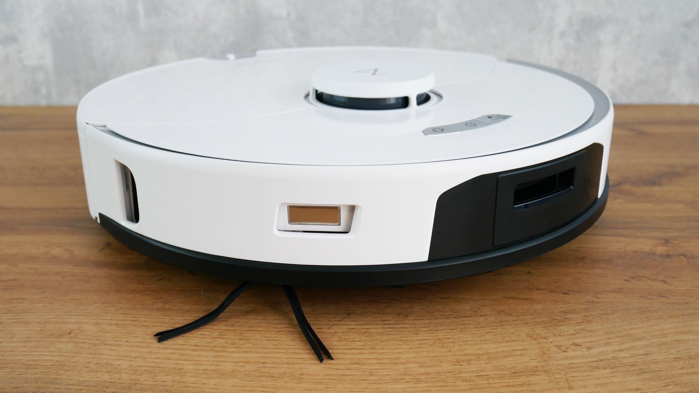 Dabar pažvelkime į „Roborock S7 Pro Ultra“ dizainą. Pradėkime nuo paties roboto. Jis yra juodai baltas, su apvaliu korpusu. Sienos aptikimo jutiklis yra dešinėje buferio pusėje.