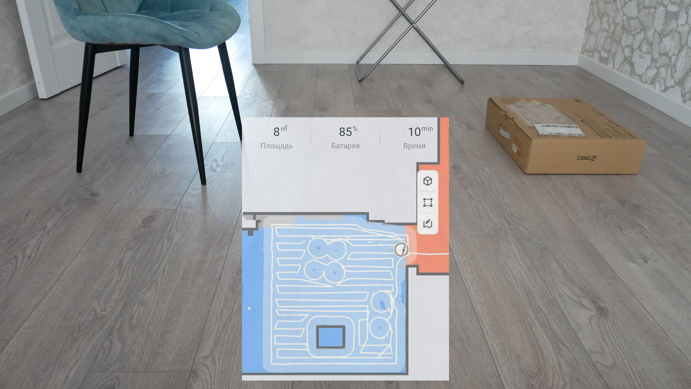 Pirmiausia išbandėme „Roborock S7 Pro Ultra“ navigaciją kambaryje su kliūtimis. Robotas dulkių siurblys pirmiausia apėjo kambario perimetrą, tada išvalė visą prieinamą plotą gyvatės formos trajektorija. Jis lengvai judėjo džiovyklės kojelėmis, o tada atskirai apšlavė dėžę ir visas džiovyklės kojeles. Šis testas buvo sėkmingai išlaikytas.