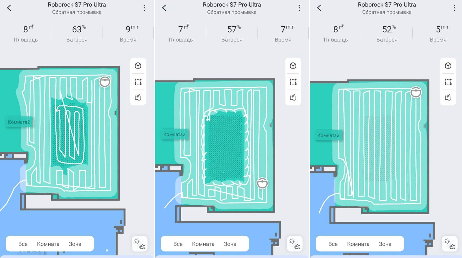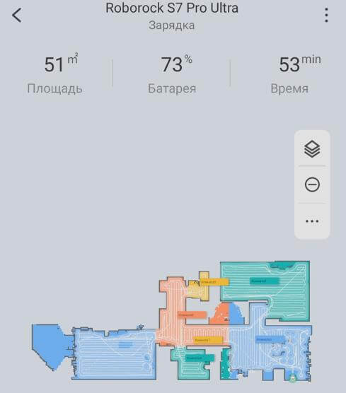Kalbant apie navigaciją visame name, „Roborock S7 Pro Ultra“ valo kambarį po kambario, pirmiausia palei perimetrą, o tada vingiuotu būdu. Jis periodiškai grįždavo į valymo stotelę, kad nuskalautų šluostę ir palaikytų valymo efektyvumą. Nebuvo jokių neišvalytų vietų, o valymo greitis buvo didelis, o tai rodo gerą navigaciją.