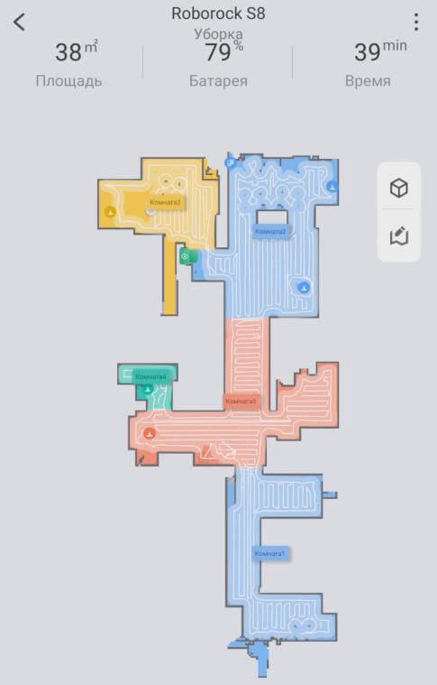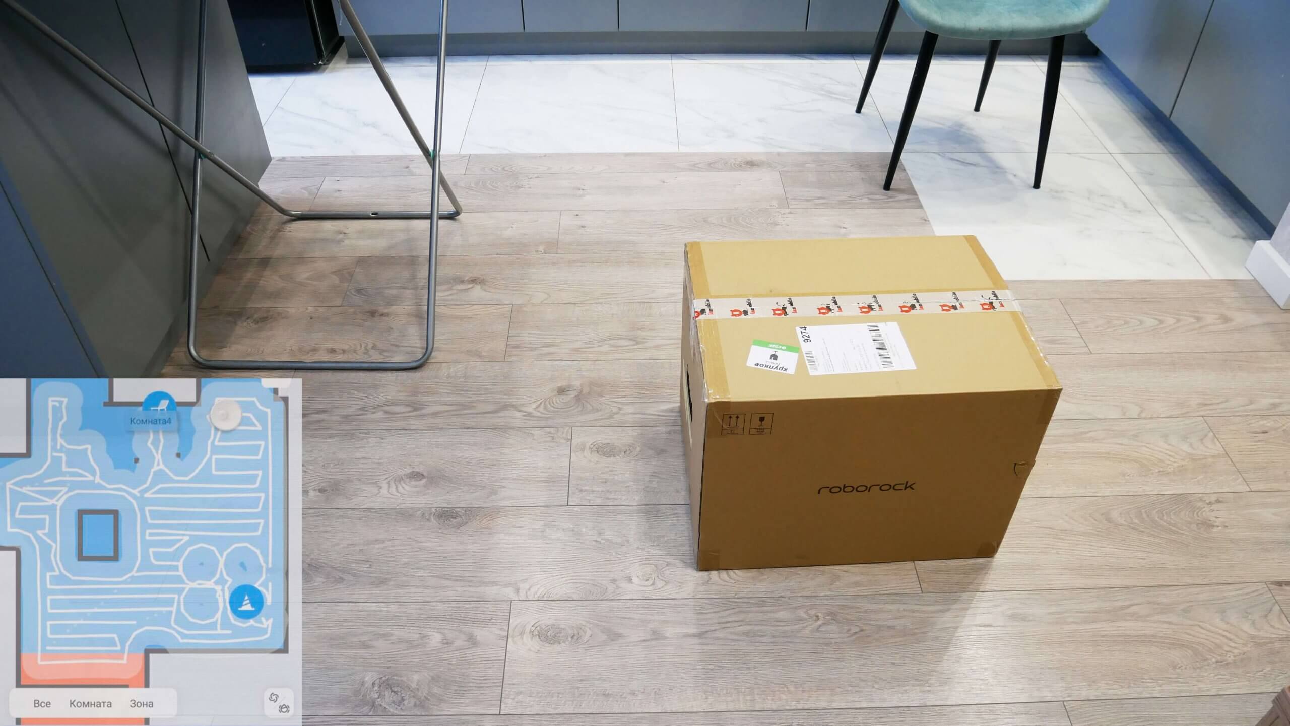 Galiausiai pereikime prie bandymų! Pirmiausia išbandysime „Roborock S8 Plus“ navigaciją kambaryje su kliūtimis. Įėjęs į kambarį, robotas-dulkių siurblys pirmiausia apeina perimetrą, tada išvalo visą prieinamą plotą vingiuotu raštu. Jis atpažino drabužių džiovyklės kojeles ir atsargiai apėjo šią kliūtį. Robotas taip pat apėjo visas keturias kėdžių kojas ir dėžę, prieš grįždamas į savo bazę. Bandymas sėkmingas!