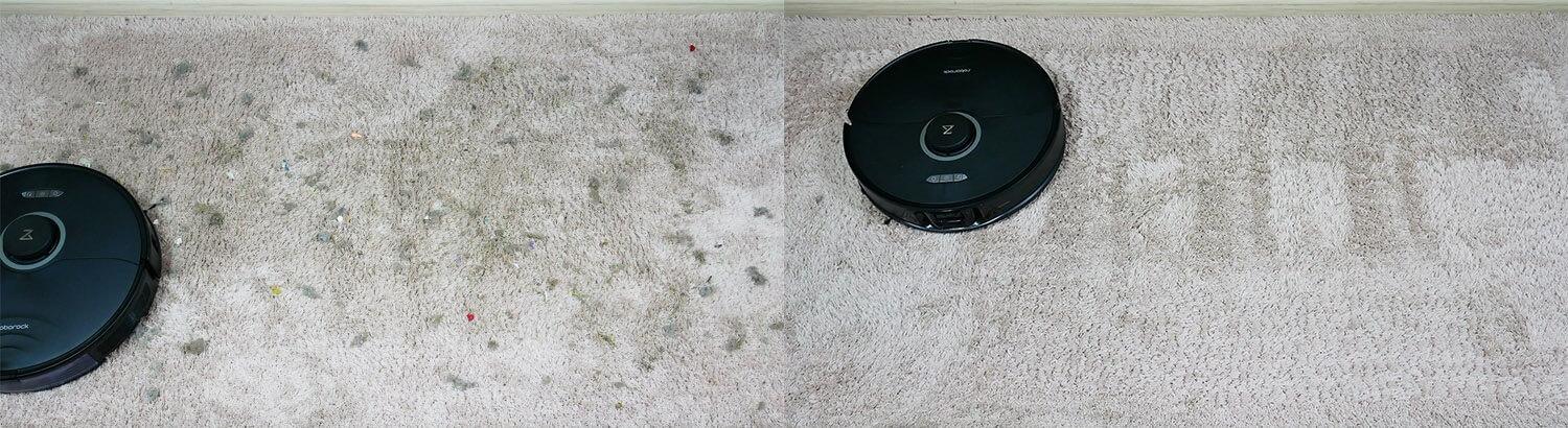 „Roborock S8 Plus“ taip pat gerai valo kilimus. Verta paminėti, kad silikoniniai turbo šepečiai šiek tiek prastesni už įprastus šerelių-žiedlapių šepečius dulkių surinkimo nuo kilimų atžvilgiu, tačiau valymo našumas namų aplinkoje vis tiek yra aukštas. Testas išlaikytas!
