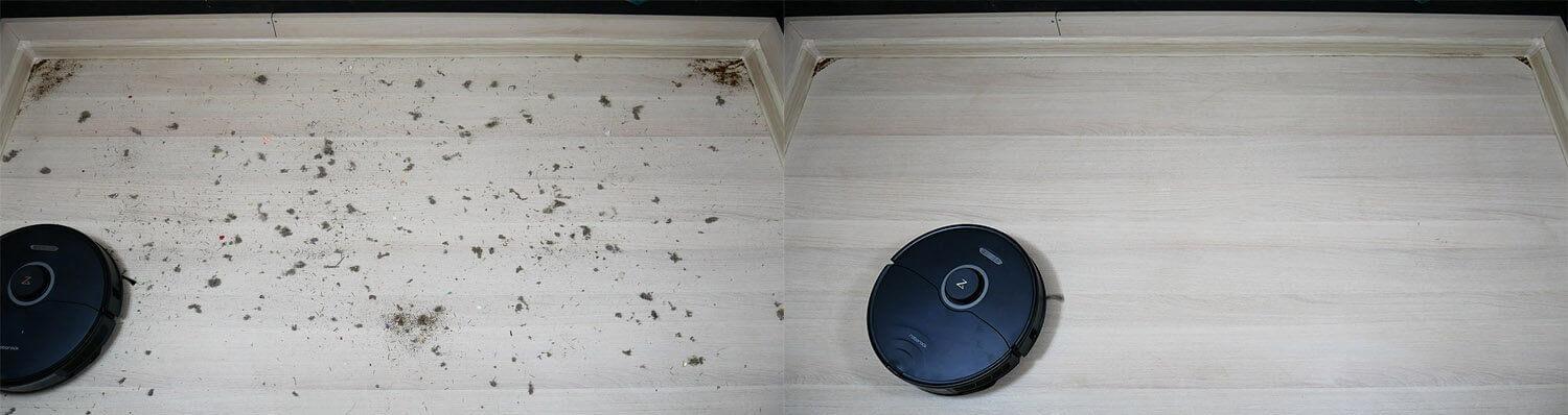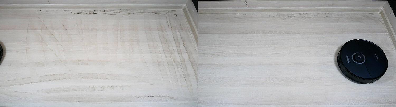 Valymo efektyvumas taip pat puikus. Šluostė tvirtai prispaudžia prie grindų ir sugeria nešvarumus. Lieka tik siauras, neplautas plotas palei grindjuostę, kuri yra beveik visų mūsų apžvelgtų robotų dulkių siurblių silpnoji vieta.