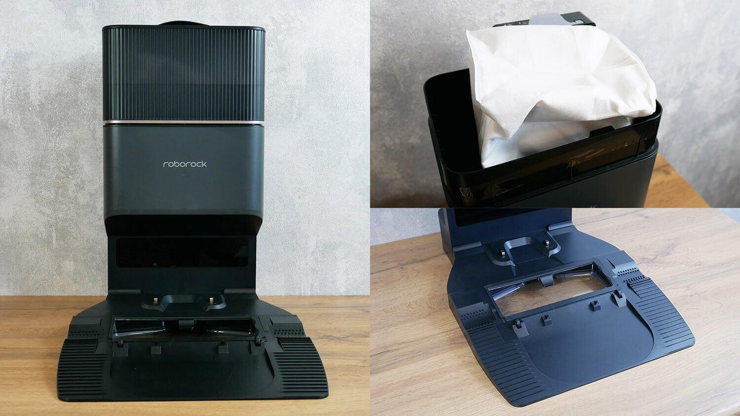 Kalbant apie stotį, ji yra identiška Roborock Q7 Max+, kuris taip pat buvo anksčiau apžvelgtas. Dulkių išmetimas vis dar vyksta per centrinį šepetėlių bloką. Jei reikia, siurbimo kanalą galima išardyti iš apačios valymui. Viršutinis stoties dangtis lengvai nuimamas. Apačioje yra dulkių maišelis. Išėmus maišelį, siurbimo kanalo sklendė užsidaro automatiškai. Pats maišelis yra gana tankus, o konstrukcijos kokybė yra geresnė nei daugumos robotinių dulkių siurblių „AliExpress“ platformoje.