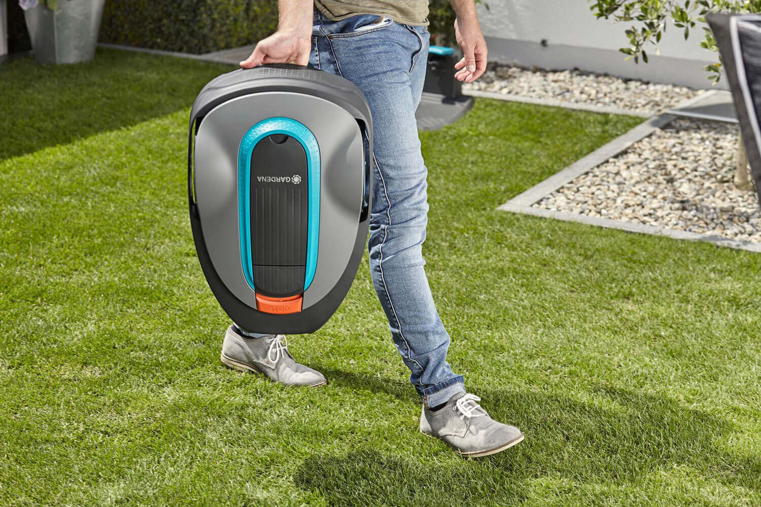 GARDENA vejos pjovimo robotų konstrukcija leidžia greitai išvalyti korpusą, besisukančias kojeles ir ratus nuo susikaupusių dulkių, nešvarumų ir žolės šiukšlių naudojant sodo žarną.