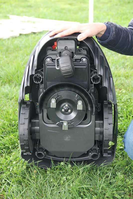 Žvelgiant į robotinės vejapjovės galą, matome ratus, pjovimo mechanizmą ir diską, įmontuotą nešimo rankeną, taip pat bloką su elektros komponentais, akumuliatorių ir variklius.