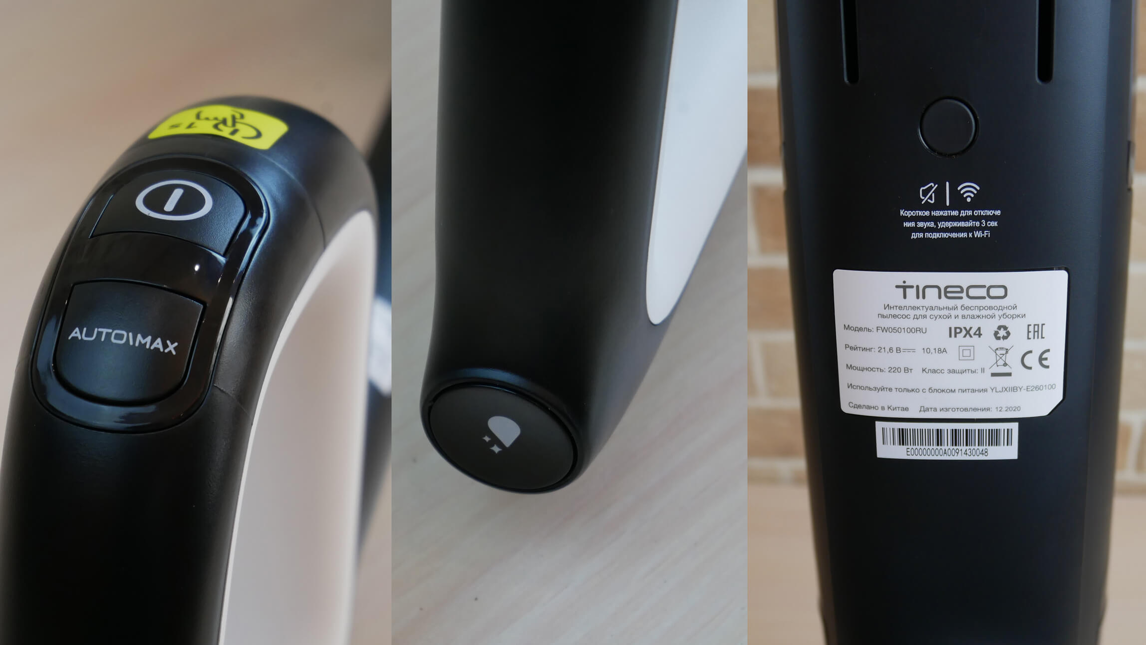 Rankenoje yra trys mechaniniai mygtukai: savaiminio valymo, galios reguliavimo ir įjungimo/išjungimo. Korpuso gale yra mygtukas, skirtas dulkių siurbliui prijungti prie „Wi-Fi“ tinklo. Jo paskirtį paaiškinsiu šiek tiek vėliau.