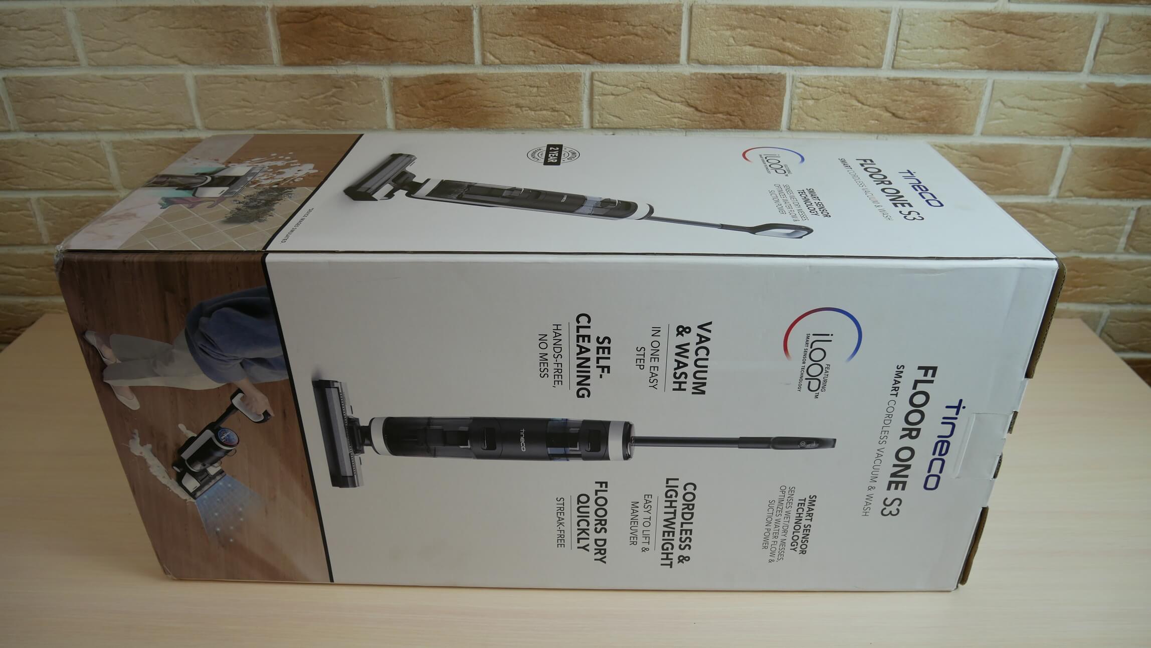 Kaip įprasta, pirmiausia pažvelkime į pakuotės turinį. „Tineco Floor One S3“ atkeliavo šioje firminėje dėžutėje: