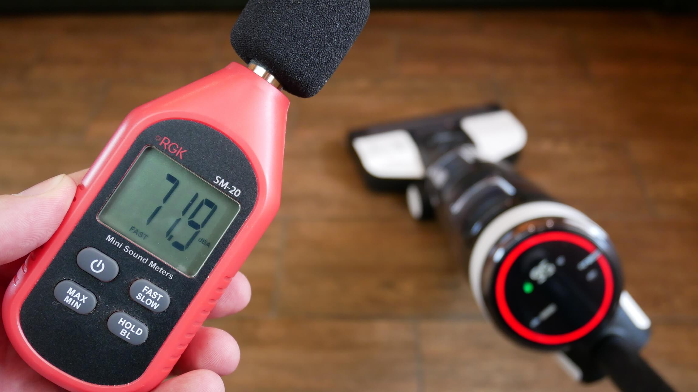 Paskutinis bandymas yra triukšmo lygio matavimai. Automatiniu režimu jis neviršija 71,5 dB, o esant maksimaliai galiai triukšmo lygis gali siekti 73,5 dB. Tai nėra itin garsu. Kai kurių rankinių dulkių siurblių triukšmo lygis viršija 80 dB.