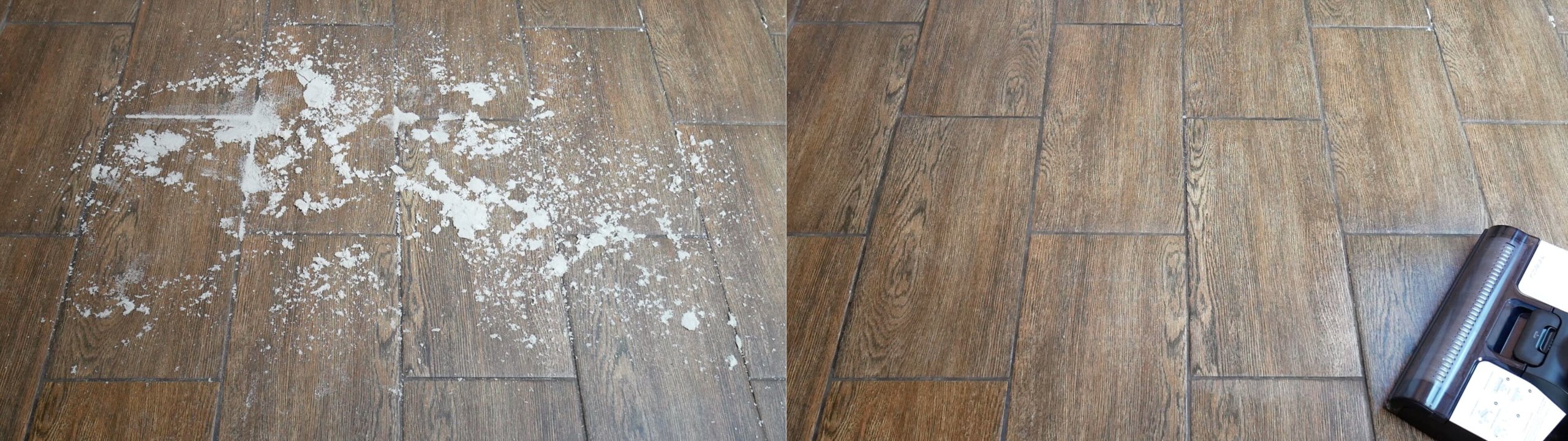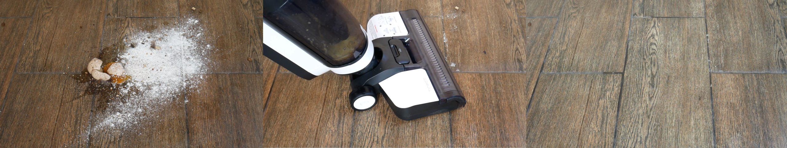 „Tineco Floor One S3“ sugebėjo surinkti nuo grindų visus nešvarumus, net ir kiaušinio lukštą. Kadangi plytelės buvo paklotos šiek tiek nelygiai, prie glaisto liko šiek tiek nešvarumų, tačiau ant lygių, plokščių paviršių, tokių kaip laminatas ar linoleumas, valymo rezultatai bus puikūs.