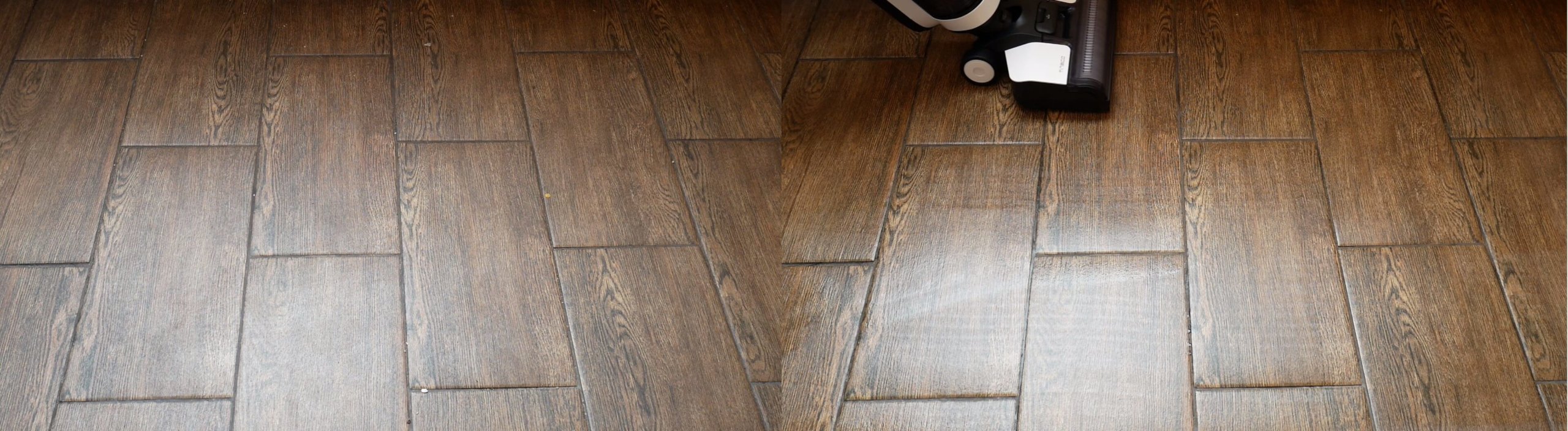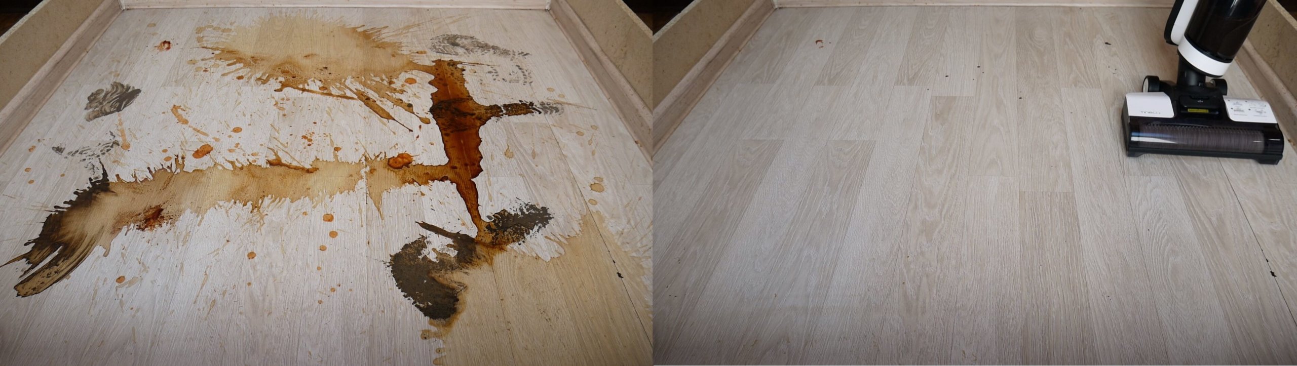 Kaip matote, liko tik kelios nedidelės dėmės, giliai įsisenėjusios grindyse ir sunkiai pašalinamos rankomis. Tačiau apskritai valymo našumas yra labai aukštas, nors ši mašina skirta kasdieniam šlapiam valymui ir vargu ar bus naudojama tokioms stiprioms dėmėms valyti namų aplinkoje.