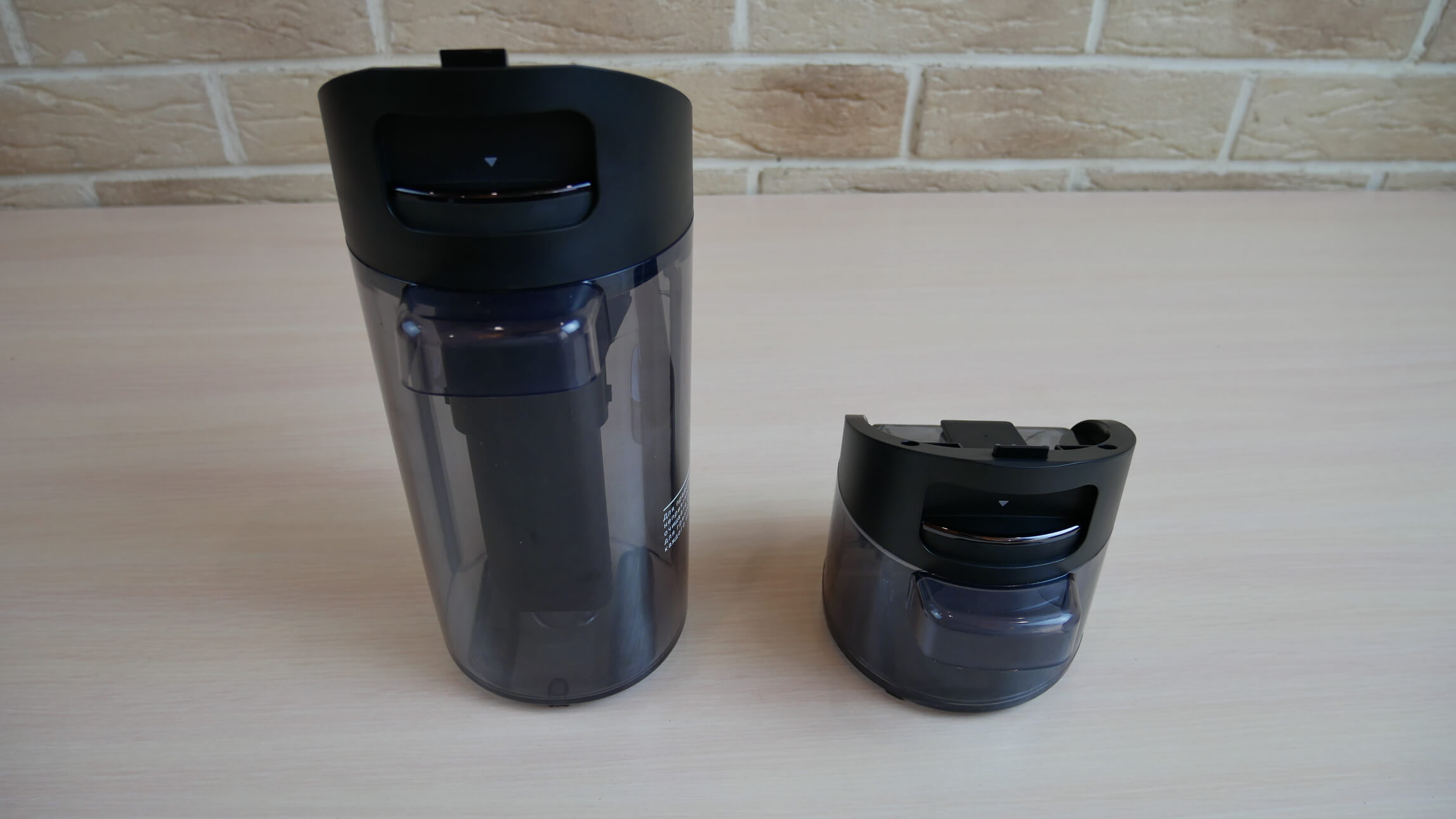Dabar pažvelkime į „Tineco Floor One S3“ dizainą. Svarbiausia atkreipti dėmesį į dvi talpyklas: vieną švariam vandeniui, kitą – nešvariam. Švaraus vandens talpykloje telpa 600 ml skysčio, o antroje, nepaisant vizualiai didelio dydžio, telpa tik 500 ml nešvaraus vandens. Maksimalus nešvaraus vandens lygio žymė yra maždaug talpyklos viduryje.