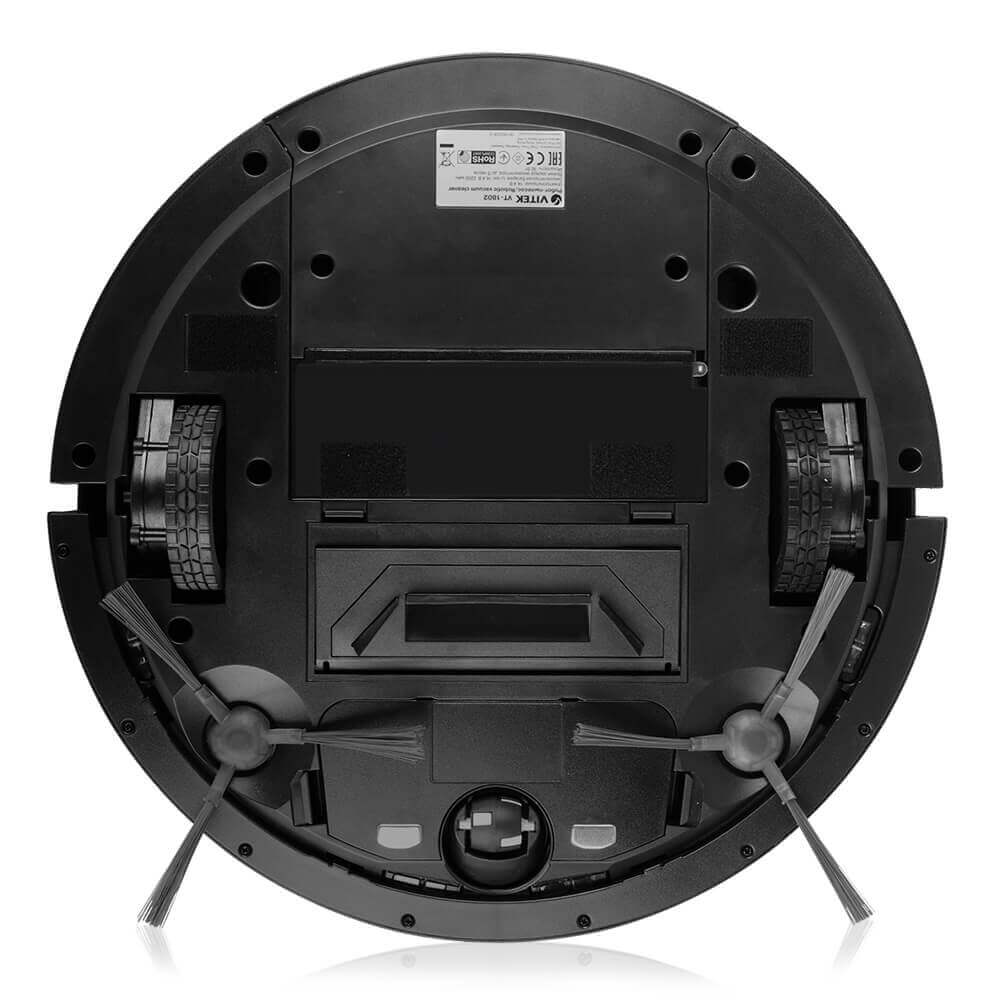 Apžvelgiant „VITEK VT-1802“ iš galo, galite pamatyti didelius varančius ratus, pasukamą volelį, kontaktinius padėklus, skirtus prijungti prie įkrovimo pagrindo, keturias poras apsaugos nuo kritimo jutiklių, akumuliatoriaus skyrių, du šoninius šepetėlius ir siurbimo angą.
