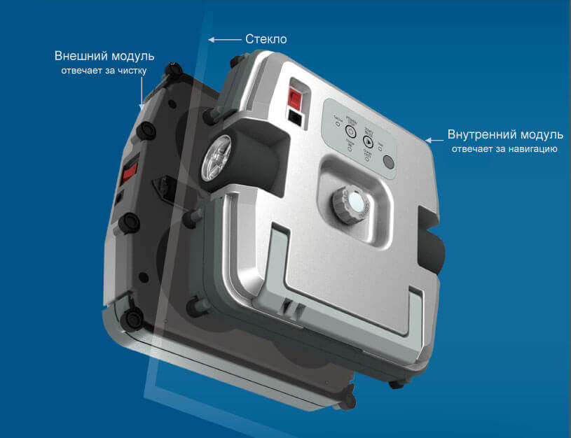 Robotinio valiklio valymo įrenginio apačioje yra keturi besisukantys diskai, prie kurių pritvirtintos mikropluošto šluostės. Jame taip pat yra du grandikliai, skirti stiklo kraštams valyti. Atidžiai apžiūrėjus korpuso dugną, paaiškėjo, kad robotą varo du maži cilindriniai ratai ir aštuoni mažesni ratai, išdėstyti aplink korpuso perimetrą. Korpuse yra baterija ir magnetų variklis.