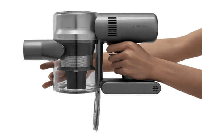 Dulkių talpykla ištuštinama paspaudus mygtuką apačioje, todėl ištuštinant talpyklą rankos nesusiteps šiukšlėmis.