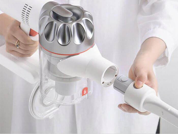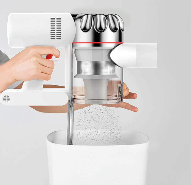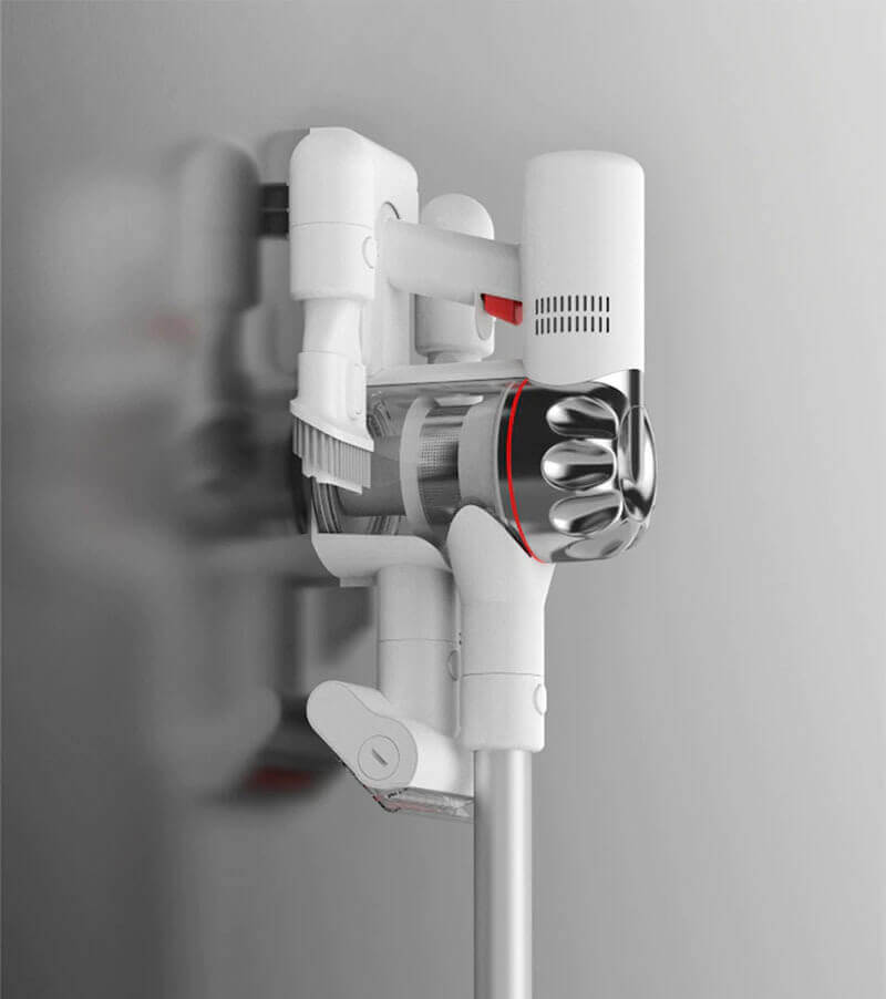 Pagrindinis įrenginys, kurį sudaro cikloninis filtras, dulkių surinktuvas, akumuliatorius, maitinimo mygtukas, maitinimo valdymo slankiklis ir maitinimo prievadas, yra paprastas ir kompaktiškas. Vos 1,5 kilogramo sverianti rankena patogiai telpa delne. Norėdami įjungti dulkių siurblį, tiesiog paspauskite raudoną gaiduką. Kita ranka režimą galite reguliuoti naudodami slankiklį gale.
