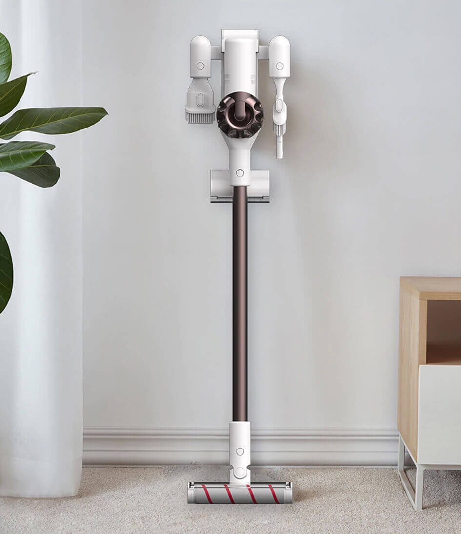 Patogiam įkrovimui „Xiaomi Dreame XR“ lazdinis dulkių siurblys turi sieninį laikiklį (pagrindą), kuris taip pat tarnauja kaip priedų laikymo vieta. Pagrindas taip pat atlieka įkrovimo stotelės funkciją. Aiškus ir apgalvotas sprendimas.