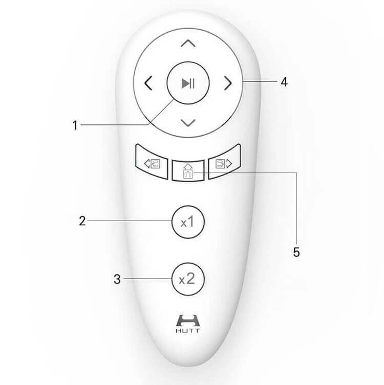 Norėdami pasirinkti vieną iš galimų veikimo režimų, naudokite nuotolinio valdymo pultą, kuris yra pridėtas prie HUTT W55. Nuotolinio valdymo pulte yra mygtukai įjungimui / pristabdymui (1) ir vieno (W raštas, 2) arba dvigubo (W+Z raštas, 3) valymo rašto pasirinkimui (5). Keturi mygtukai nuotolinio valdymo pulto viršuje naudojami langų valymo robotui rankiniu būdu valdyti bet kuria kryptimi (4).