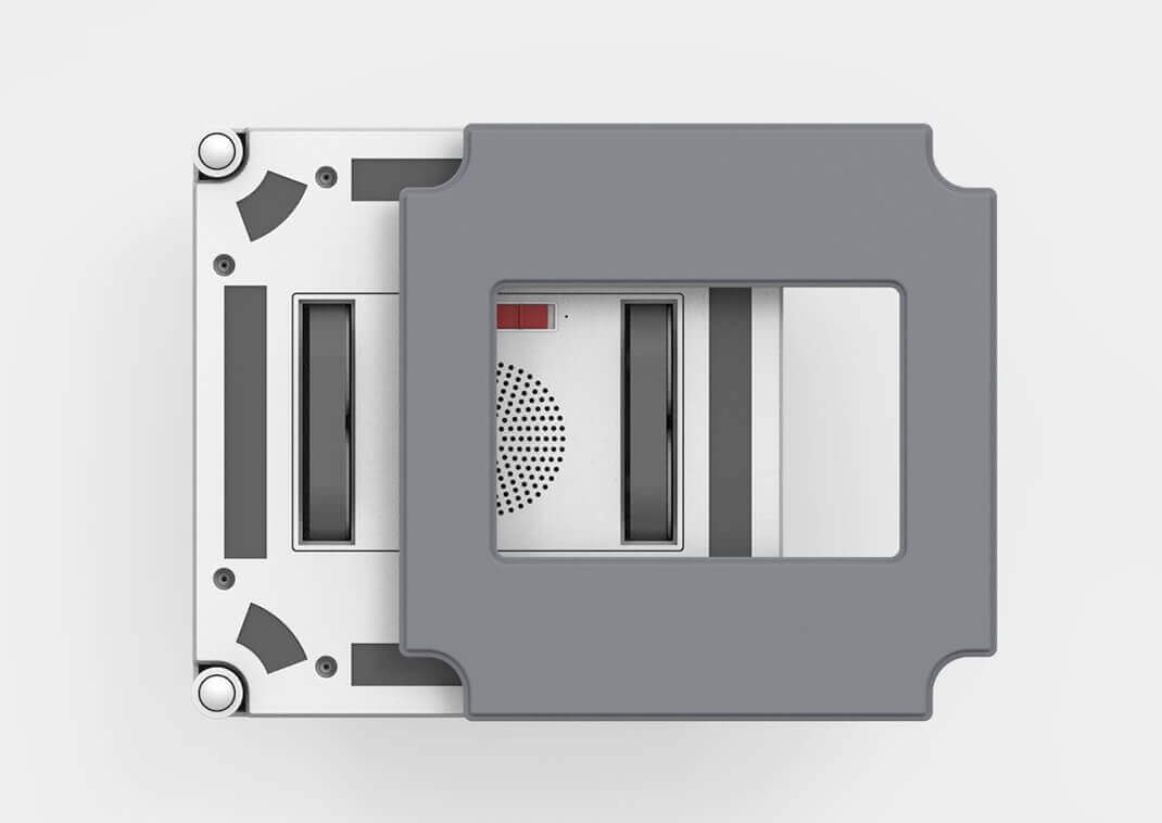 HUTT W55 langų valytuvas pagamintas iš balto ABS plastiko, kuris atsparus pirštų atspaudams. Roboto korpusas yra kvadratinis ir matinės apdailos.