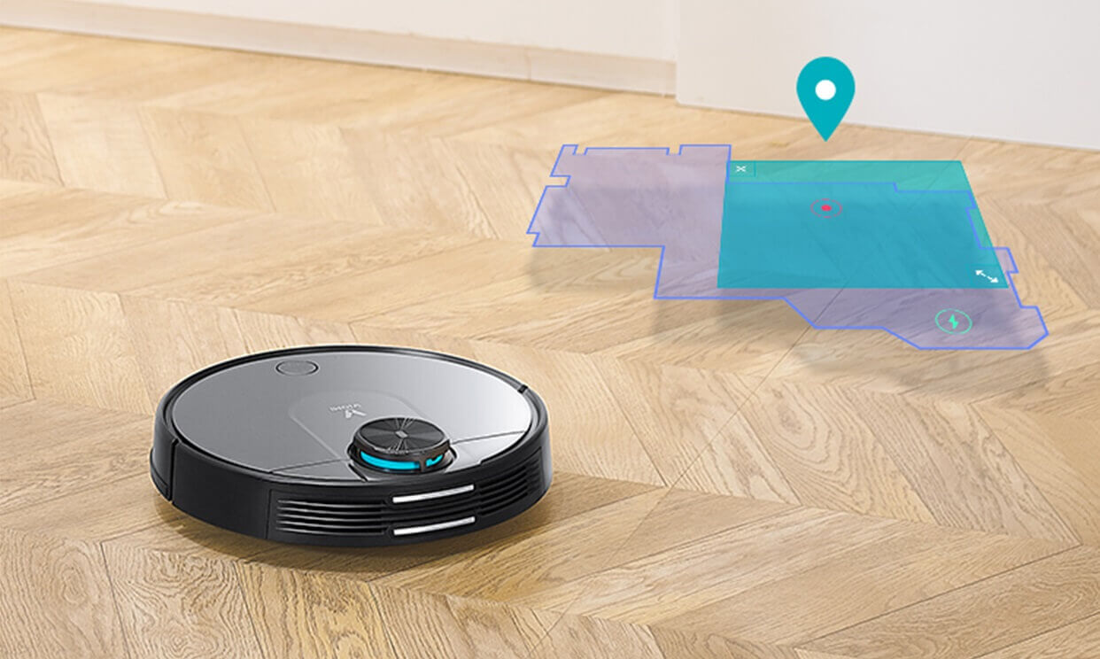 Pradėkime nuo roboto dulkių siurblio savybių apžvalgos. Pagrindinis „Xiaomi Viomi Cleaning Robot“ išskirtinis bruožas yra įmontuotas lazerinis atstumo ieškiklis, esantis išsikišusio bokštelio viduje. Lazeris nuskaito valymo plotą, sukuria kambario žemėlapį ir automatiškai nustato valymo vietas. Ši žemėlapių sudarymo funkcija leidžia robotui dulkių siurbliui naršyti po jau išvalytas zonas nešvaistant akumuliatoriaus energijos. Navigacija dabar yra efektyvesnė dėl LIDAR ir SLAM technologijų.