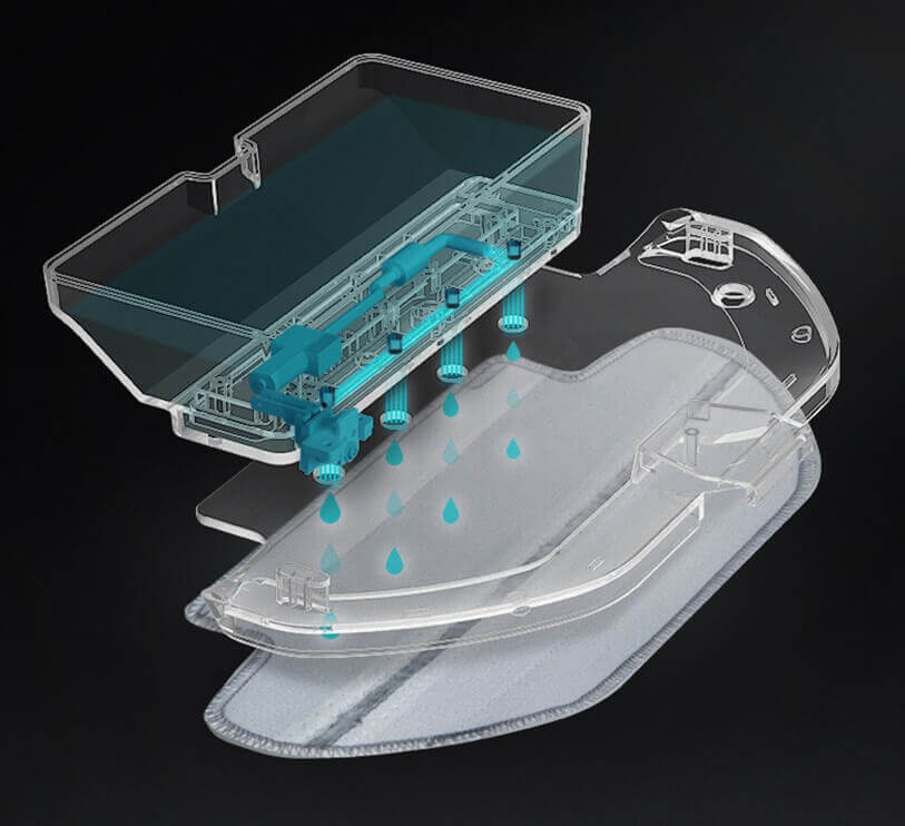 Šlapiam valymui robotas dulkių siurblys turi atskirą 560 mililitrų vandens baką, kuris pakeičia kietųjų atliekų konteinerį. Pridedamos dvi šluostės: viena grindims šluostyti (sugerianti ir tinkama didesniems kambariams), o kita – paviršiui drėkinti, kol „Xiaomi Viomi Cleaning Robot“ siurbia. Kai nenaudojamas, vanduo iš bako nenuteka ant grindų.
