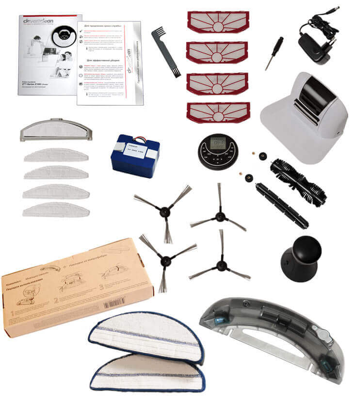 Kaip matote iš apžvalgos, robotas dulkių siurblys pateikiamas su visu atsarginių dalių ir eksploatacinių medžiagų asortimentu. Trūksta tik nuotolinio valdymo pulto ir judesio ribotuvo baterijų.