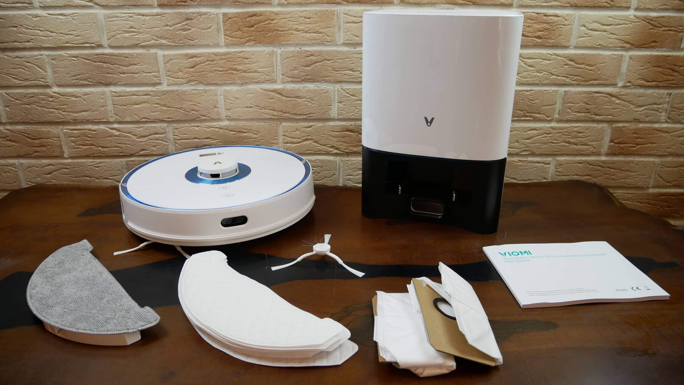 Pirmiausia pažvelkime į „Viomi S9 UV“ rinkinį. Be paties roboto ir savaiminio valymo pagrindo, rinkinį sudaro: