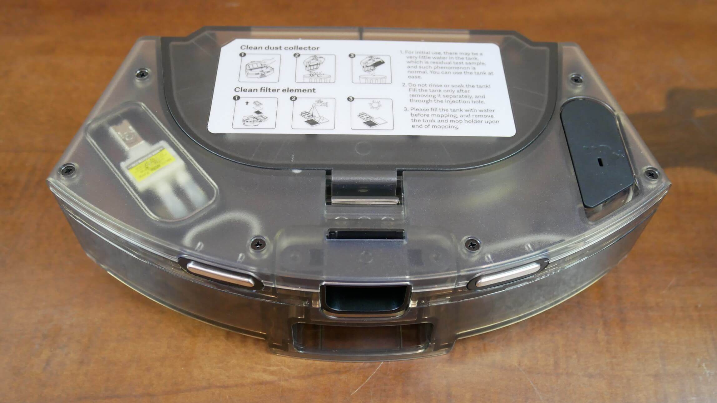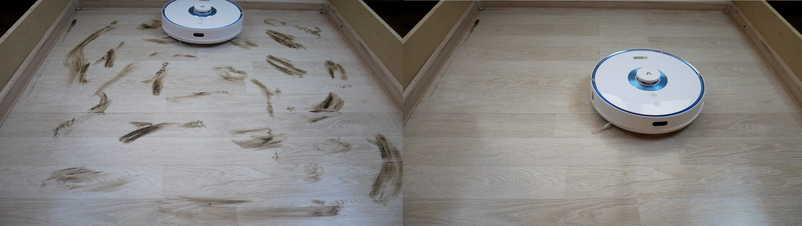 Kaip visada, dėl šlapio valymo didelių nusiskundimų nebuvo. Robotas sugebėjo pašalinti šiek tiek pridžiūvusių nešvarumų nuo grindų. Jis paliko tik nedidelį ruoželį palei grindjuostę, tačiau tai yra probleminė vieta visiems mūsų testuotiems robotams.