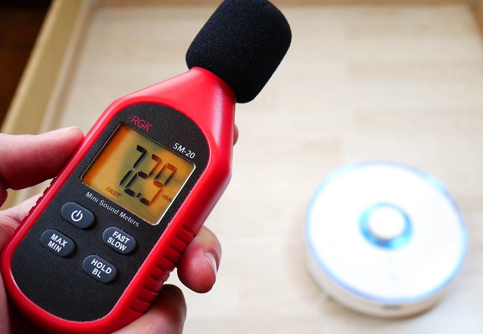 Galiausiai, patikrinkime „Viomi S9 UV“ triukšmo lygį skirtingais režimais. Grindų poliravimo režimu triukšmo lygis svyruoja nuo 58 iki 61 dB. Esant minimaliai siurbimo galiai, jis siekia 65 dB, standartiniu režimu – apie 69 dB, vidutiniu galingumu – 72,5 dB, o „Violence“ režimu didžiausias triukšmo lygis buvo 74 dB.