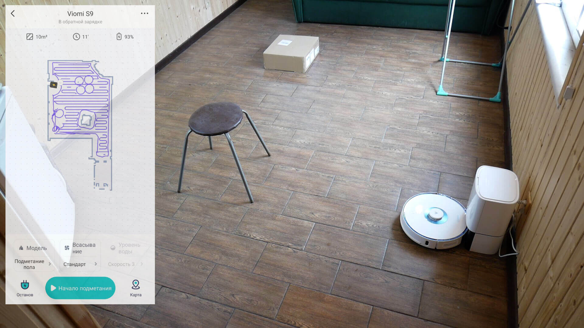 Galiausiai pereikime prie bandymų. Pirmiausia išbandysime „Viomi S9 UV“ navigaciją kambaryje su kliūtimis. Robotas dulkių siurblys pirmiausia apeina kambario perimetrą, o tada persijungia į gyvatinį modelį visame pasiekiamame plote. Jis neužstrigo ant džiovyklės ir atskirai apėjo kiekvieną kėdės koją bei dėžę, o tada sėkmingai grįžo į savo pagrindą ir pradėjo savaiminį valymą. Bandymas buvo sėkmingas.