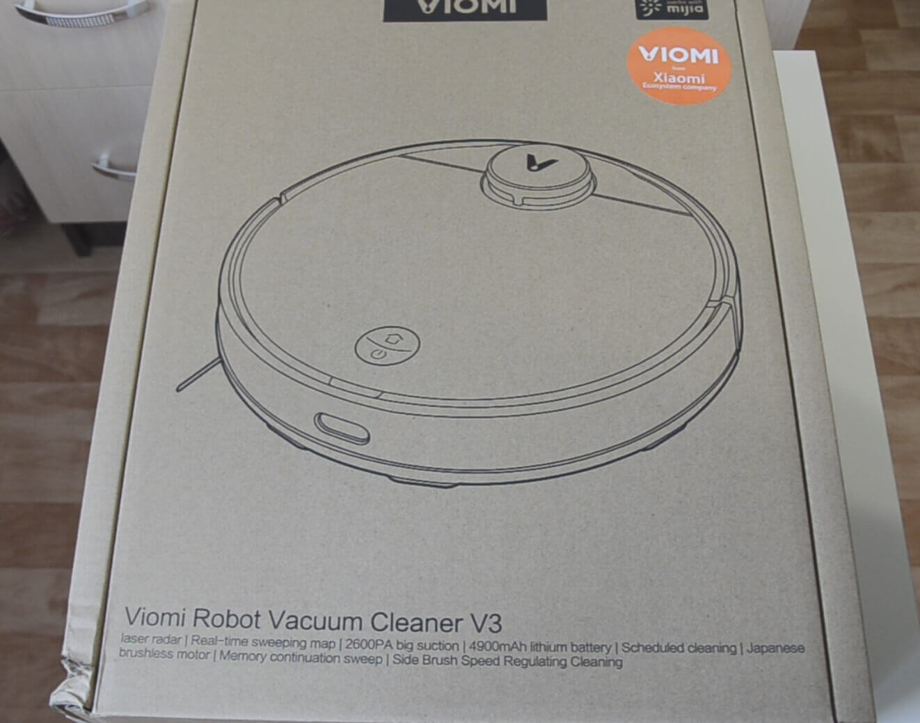 Pradėkime nuo išpakavimo. „Vioimi V3“ yra firminėje kartoninėje dėžutėje. Matote patį robotą dulkių siurblį. Jame įrengtas lidaro jutiklis navigacijai. Ant pačios dėžutės nurodyta, kad robotas sudaro kambario žemėlapį, jo siurbimo galia yra 2600 Pa, o baterija – 4900 mAh – nebloga pradžia! Iš visų mūsų išbandytų robotų šis deklaruoja didžiausią galią.