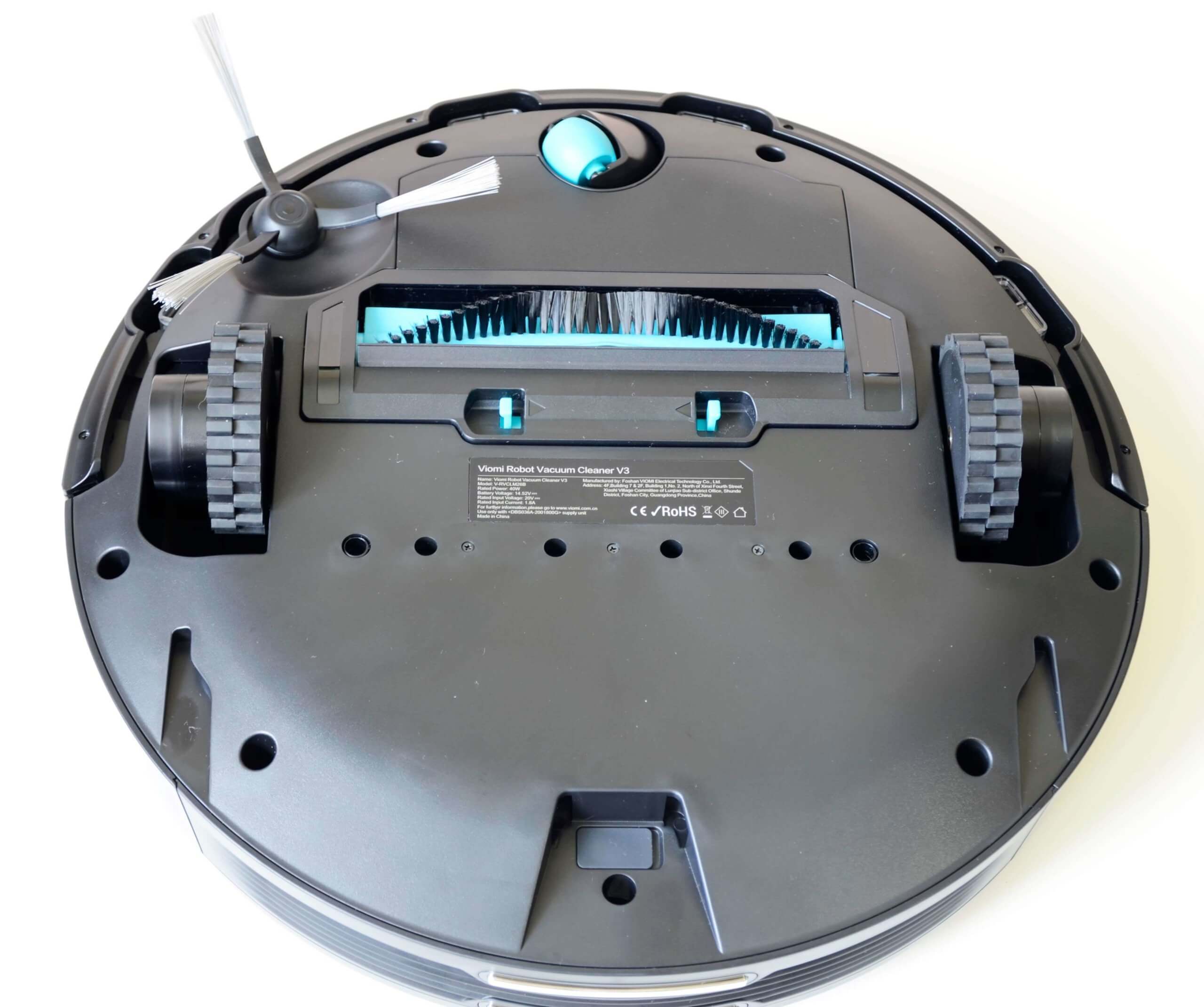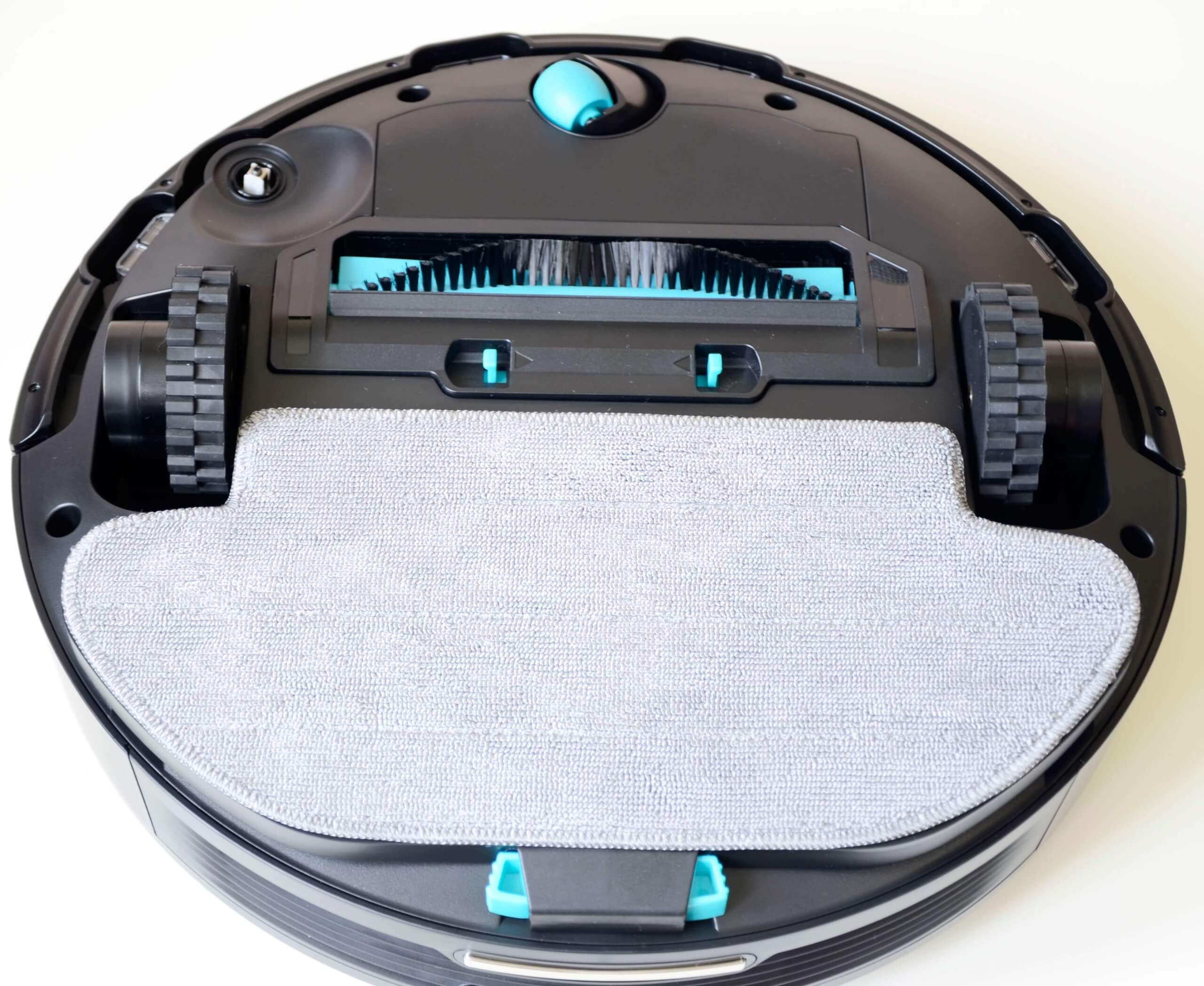 Apverskime robotinį dulkių siurblį aukštyn kojomis ir apžiūrėkime jo apačią. Priekyje sumontuotas pasukamas volelis. Šis modelis turi vieną šoninį šepetį. Centrinis šepetys yra sudarytas iš nenuimamų šerelių ir žiedlapių. Drėgno valymo antgalis pritvirtintas prie įrenginio galo.