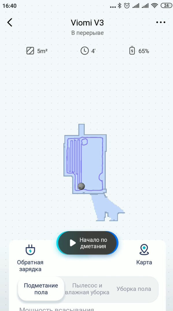 Kalbant apie „Vioimi V3“ funkcionalumą, panagrinėkime jį programėlėje. Pagrindiniame prietaisų skydelyje galite matyti kambario žemėlapį po paskutinio valymo ciklo, taip pat informaciją apie paskutinį valymą. Kaip matote, robotas išvalė 5 kvadratinius metrus per 4 minutes. Likusi akumuliatoriaus įkrova yra 65 %.
