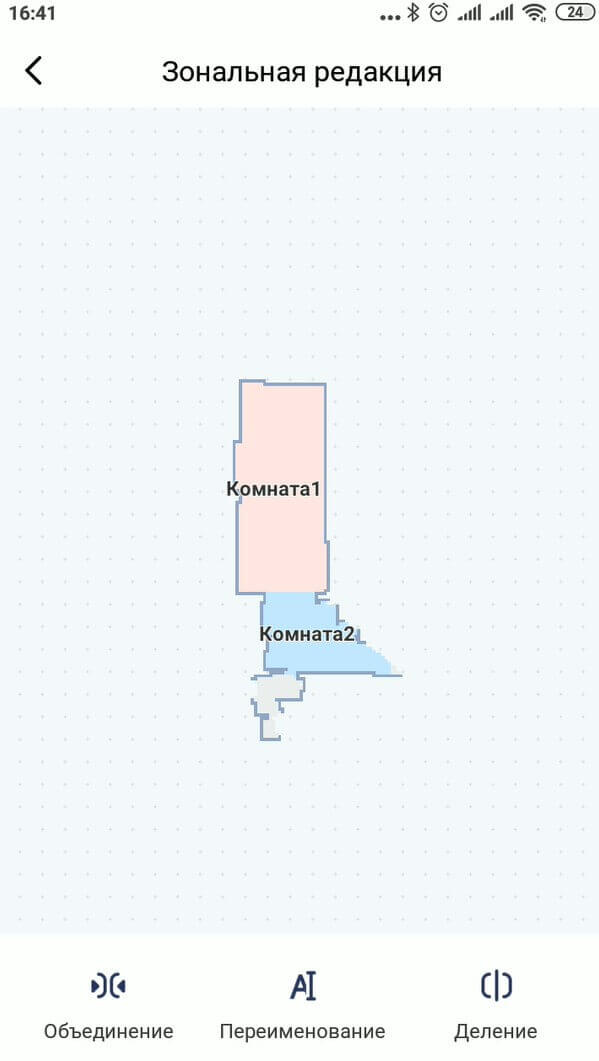 Apačioje yra mygtukas, skirtas priversti robotą grįžti į bazę įkrovimui ir pasiekti žemėlapį. Kadangi robotas dulkių siurblys padalija kambarį į kambarius, galite sujungti kelis kambarius į vieną arba, atvirkščiai, padalinti kambarį į atskiras zonas ir joms suteikti pavadinimus.