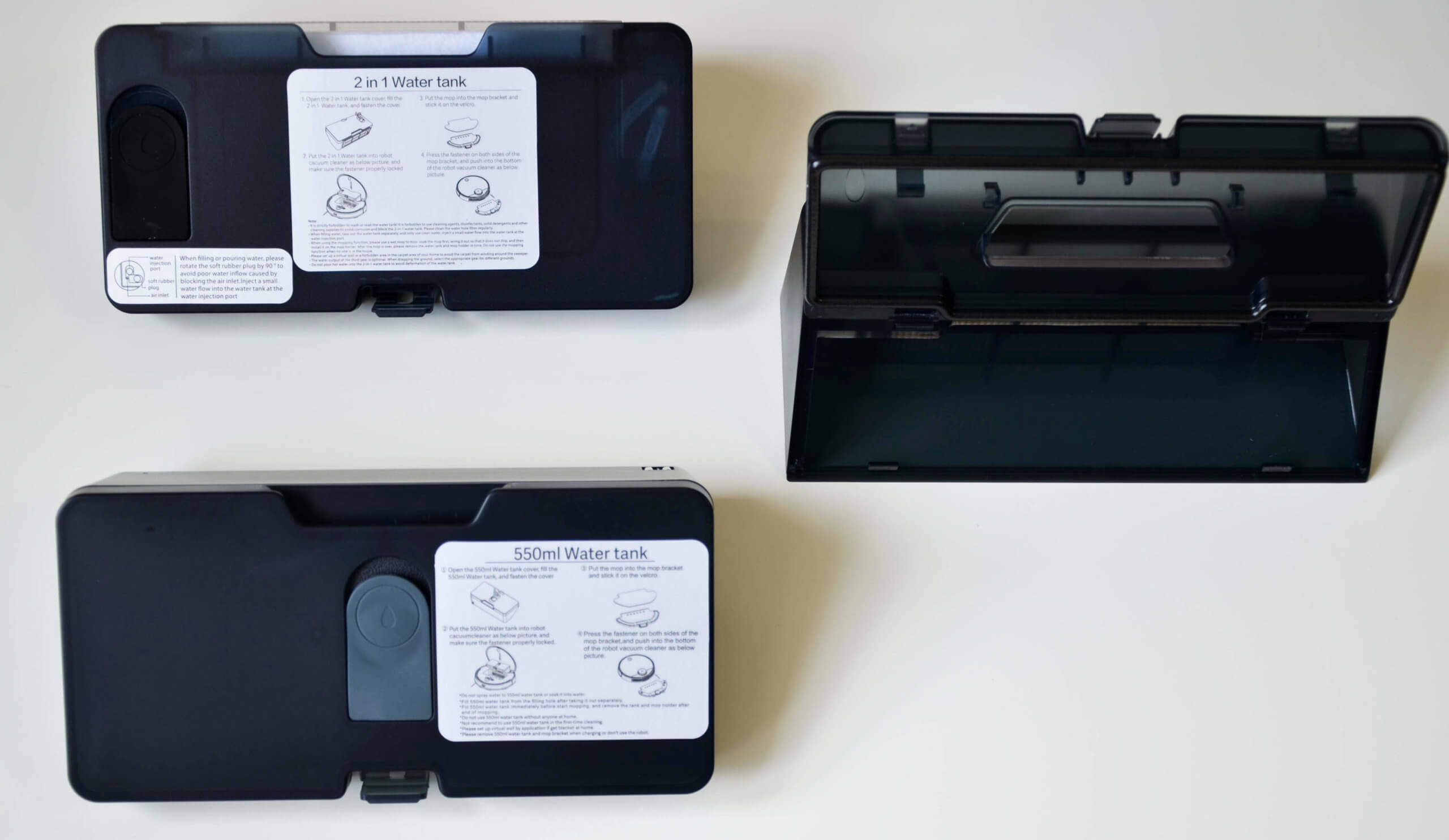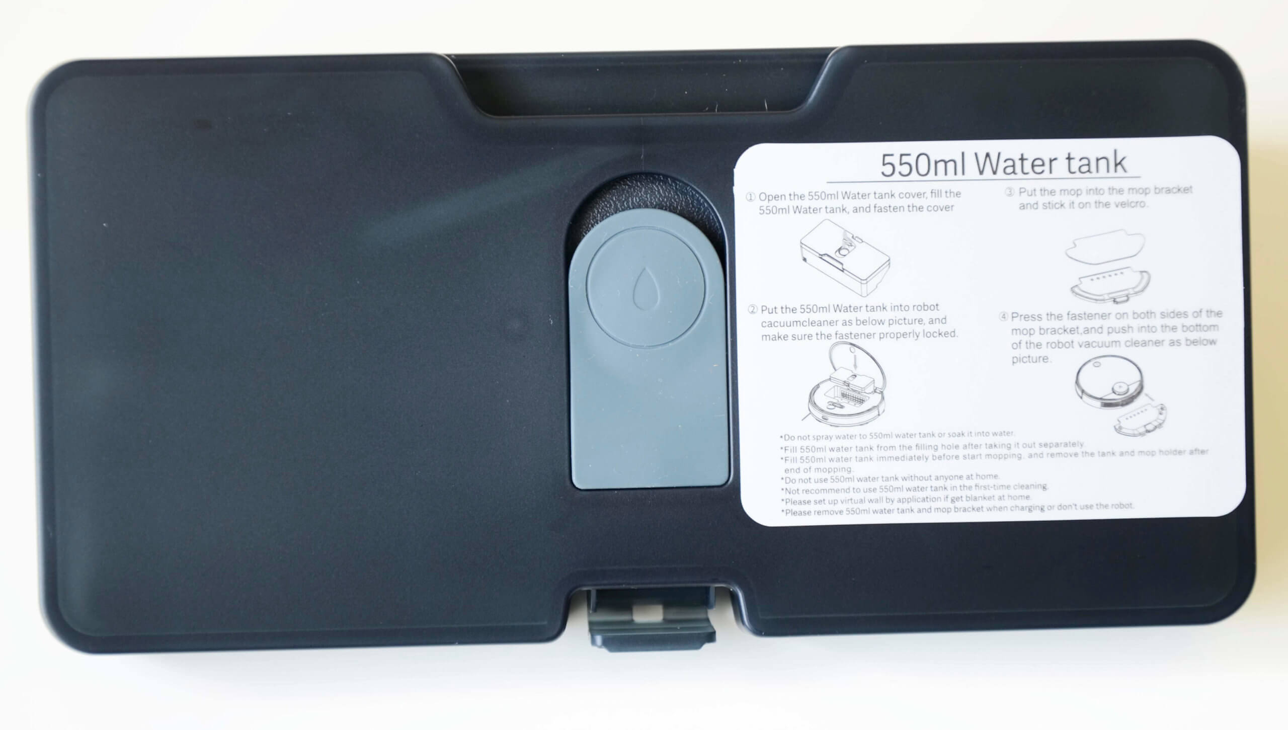Pridedamos keičiamos vandens talpos nusipelno ypatingo dėmesio. Atskiros vandens talpos yra 550 ml. Įrengtas robotas atliks tik šlapią valymą. Šio vandens kiekio pakanka gana dideliam plotui, daugiau nei 100 kvadratinių metrų. Vandens užpildymo anga yra viršuje ir turi sandarų vožtuvą.