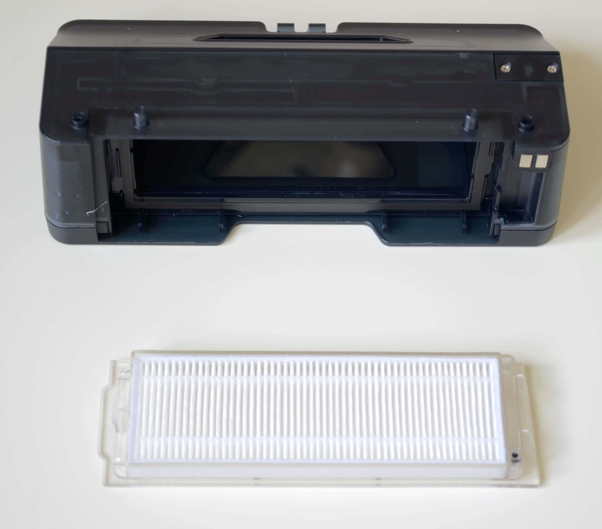 Šis dulkių konteineris turi dangtelį, kad būtų lengva pašalinti šiukšles. Jame taip pat yra HEPA filtras ir šiurkštus tinklelio filtras.