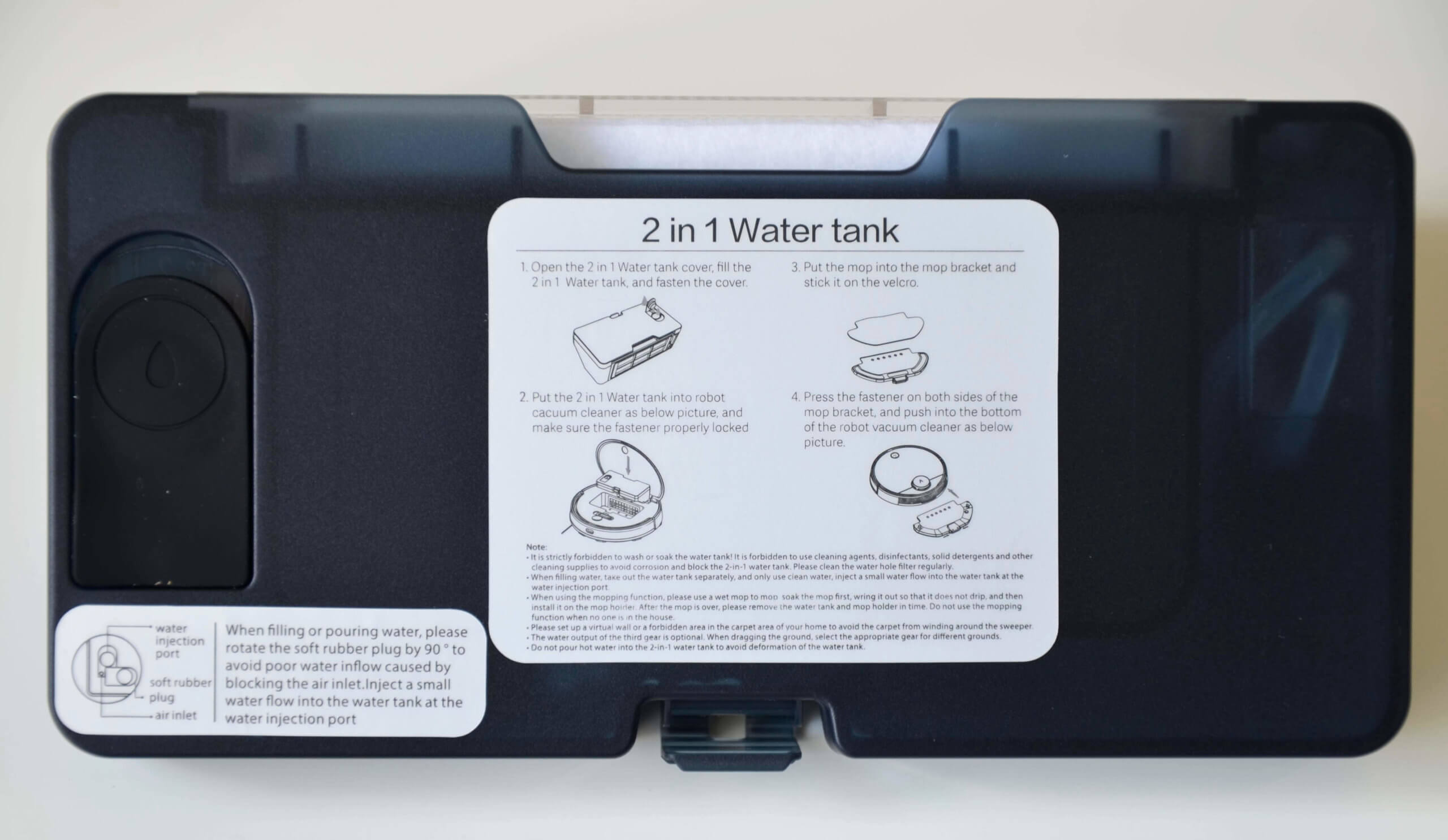 Kombinuotame inde yra vandens užpildymo anga ir iš anksto sumontuotas filtras. Gamintojas nenurodo, kad jį galima skalauti vandeniu. Pro permatomą plastiką matome įmontuotą elektroninio vandens tiekimo siurblį. Apačioje matome dvi skylutes, per kurias vanduo tiekiamas į šluostę.