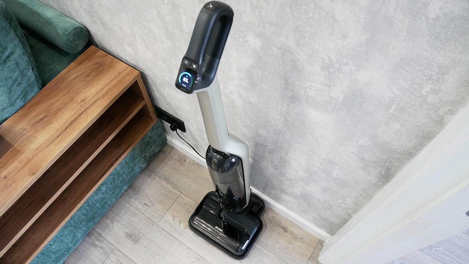 Jo kaina tikrai milžiniška, kaip ir jo dizainas. Tačiau jis turi keletą dizaino ypatybių, kurios išsiskiria iš aukščiausios klasės analogų. Būtent, atskira garų valymo funkcija arba, kitaip tariant, „sudie, parketui“. Juokauju, tai įdomus sprendimas ir efektyviai veikia valant plyteles. Įjungus specialų režimą, garai išleidžiami per keturias skylutes. Temperatūra nustatyta ties 110 laipsnių Celsijaus. Jis taip pat turi automatinį ploviklio dozatorių, pilnai veikiančią karšto oro ritininę džiovyklę, švaraus vandens bake dezinfekavimo funkciją ir paviršiaus už valymo modulio džiovinimo funkciją. Taigi, išplaunate grindis, ir jos iš karto išdžiūsta. Testų metu „Bork V810“ pademonstravo aukštos kokybės grindų valymą ir gebėjimą per trumpą laiką pašalinti net įsisenėjusias dėmes. Reikėtų atkreipti dėmesį, kad volelis tęsiasi arti įrenginio krašto, nepalikdamas praktiškai jokios aklosios zonos. Todėl apskritai man tai yra geriausias vertikalus dulkių siurblys pagal ergonomiką, savybes, grindų valymo kokybę ir dizainą. Bet, žinoma, kainos ir kokybės atžvilgiu tai nėra pats optimaliausias variantas.