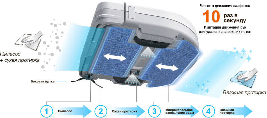 Jame sumontuotos dvi apvalios besisukančios šluostės, kurios efektyviai šveičia grindis. Robotas periodiškai automatiškai nuplauna šias šluostes specialioje stotelėje, kurioje yra švaraus ir nešvaraus vandens bakas, taip pat skyrius dulkėms išpilti iš dulkių surinktuvo į maišą stotelėje. Tai užtikrina labai autonomišką sausą ir šlapią valymą dideliuose plotuose. Naudotojui tereikia nedelsiant išleisti nešvarų vandenį iš bako, įpilti švaraus vandens į kitą baką, pakeisti maišą stotelėje ir išvalyti patį robotą, konkrečiai jo filtrą ir šepečius.