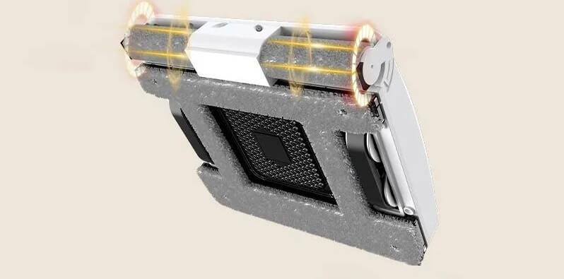 Ypač įdomus yra unikalus valymo modulis, kurį sudaro kvadratinė šluostė ir du voleliai. Gamintojo teigimu, voleliai leidžia robotui daug geriau išvalyti kampus ir pašalinti sunkiai įveikiamas dėmes. Tarp volelių yra du vandens purkštuvai, kurie dar labiau padidina langų valymo efektyvumą. Apskritai tai išties unikalaus dizaino įrenginys. Kalbant apie jo efektyvumą, reikia atlikti tolesnius bandymus.