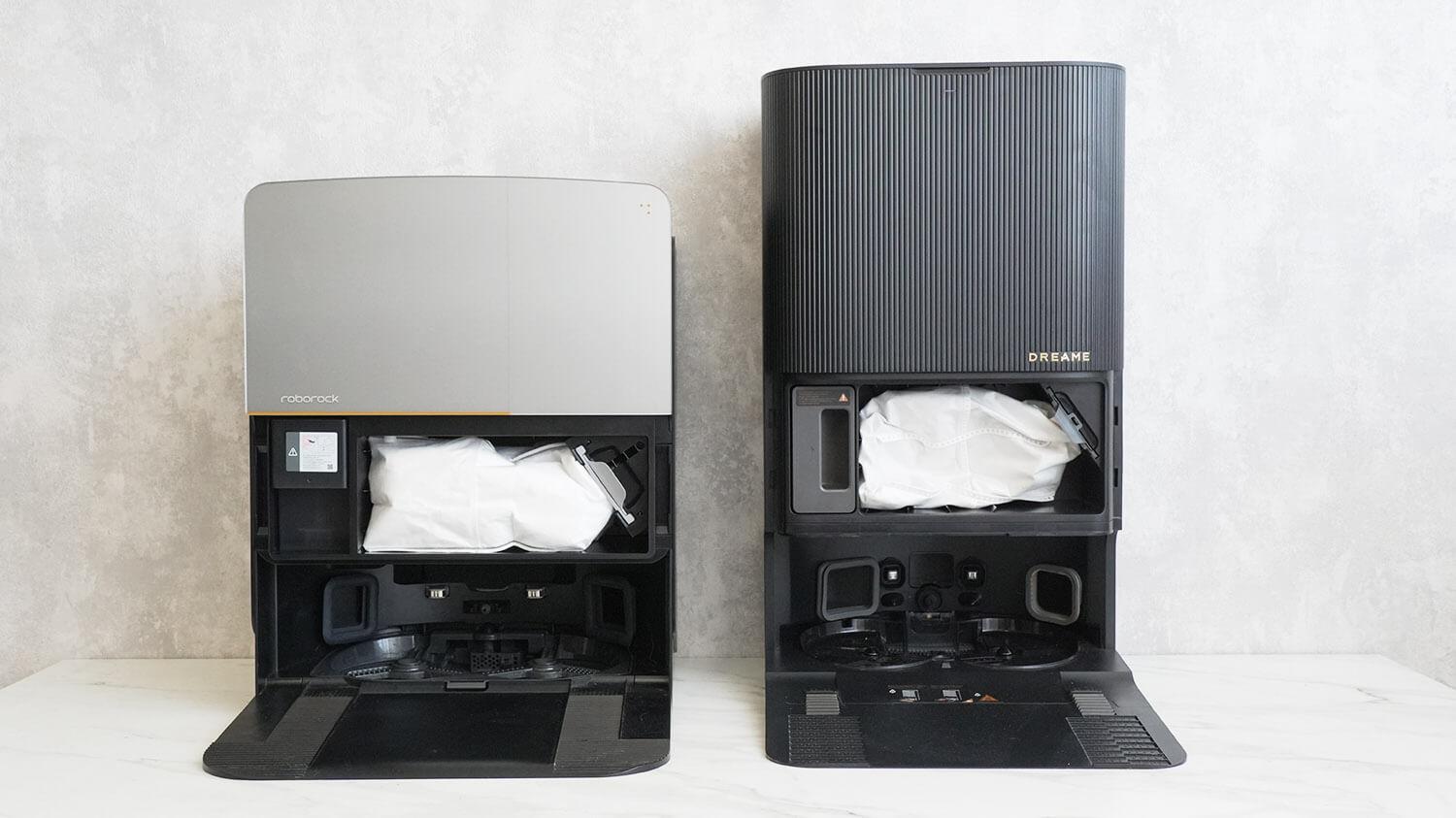 Stotys taip pat labai skiriasi. Pirma, „Dreame X50“ tiekiamas dviejų stočių versijų: standartinės, aukštos versijos su vandens bakais ir įmontuojamos versijos, skirtos prijungti prie vandens ir drenažo. Aukštoje versijoje galima įrengti modulį, skirtą prijungti tiek prie kanalizacijos, tiek prie vandens vamzdžių. Rašymo metu „Roborock“ tiekiamas tik su viena stotele – viena su vandens bakais. Ji nesuderinama su moduliu, skirtu prijungti prie kanalizacijos ir vandens vamzdžių. Taip pat yra įmontuojama stotelė, skirta prijungti prie komunalinių linijų, tačiau, deja, jos mūsų rinkoje nėra.