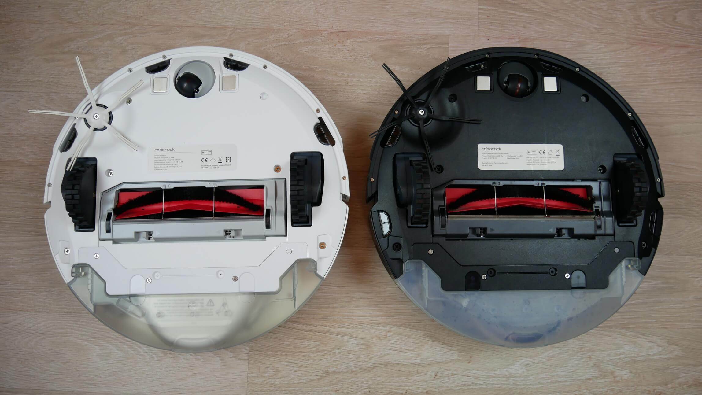 Robotų dulkių siurblių apačia taip pat labai panaši. Jie turi tą pačią ratų bazę, nuimamą centrinį šepetį, silikoninį penkių taškų šoninį šepetį, įkrovimo gnybtus ir pasukamą ratą. Vienintelis skirtumas yra nuolydžio jutiklių skaičius. „S6 MaxV“ turi šešis, o „S5 Max“ – keturis, kaip ir dauguma kitų „Roborock“ linijos robotų dulkių siurblių.