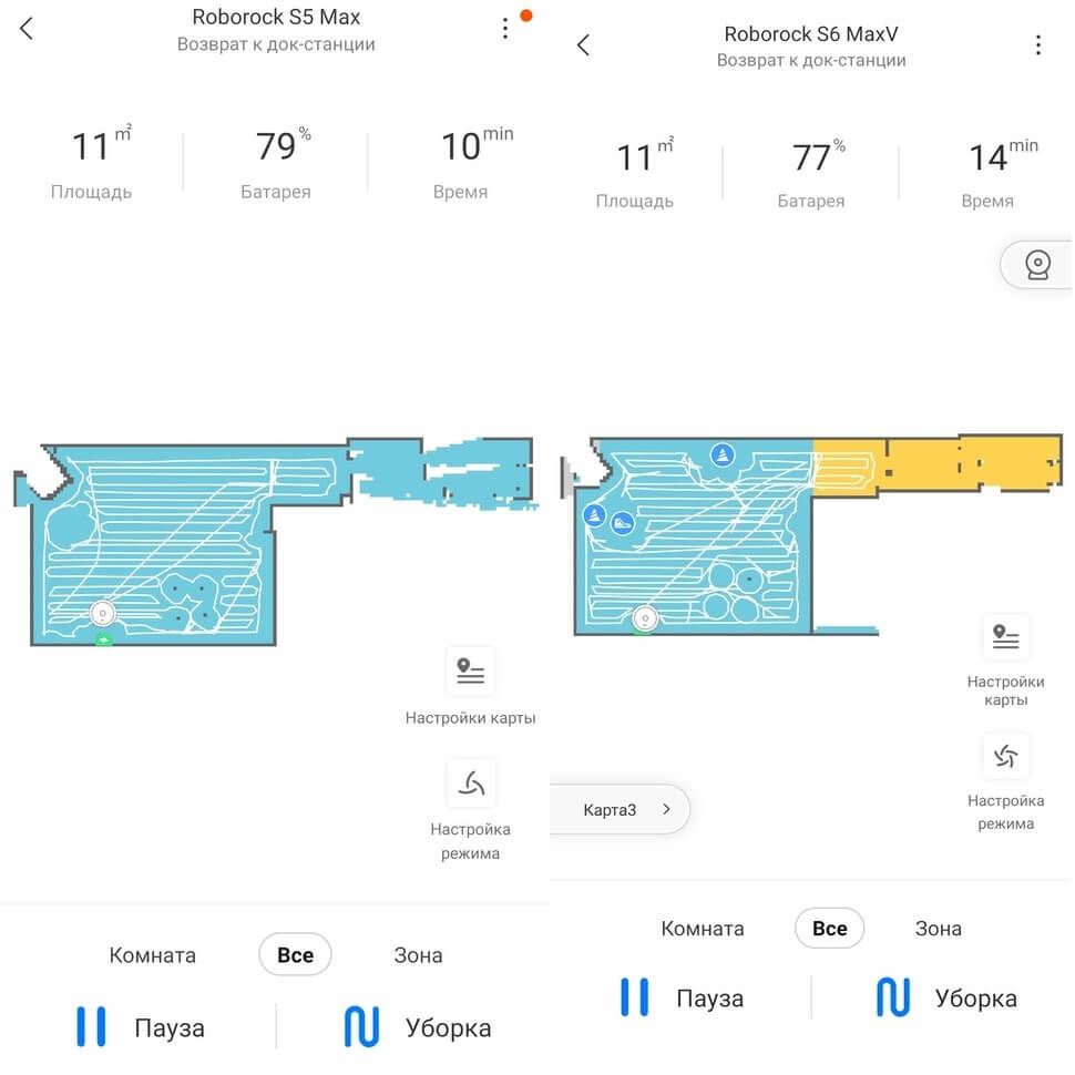 Taip pat pademonstravome, kaip robotai dulkių siurbliai veikia namuose – mūsų atveju, penkiuose kambariuose, kurių bendras naudingas plotas yra 34 kvadratiniai metrai. „Roborock S5 Max“ sukūrė tikslų kambario žemėlapį, apėmė visą plotą ir išvalė jį per 27 minutes. „Roborock S6 MaxV“ turi tą patį navigacijos algoritmą ir valymo laiką. Tai reiškia, kad robotai yra visiškai identiški navigacijos požiūriu ir yra puikiai suderinti.