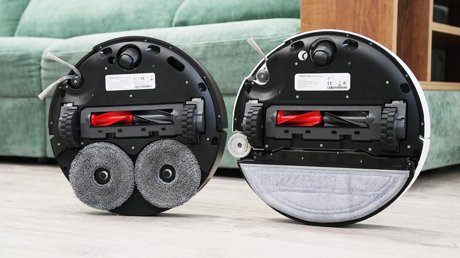 Robotų šoniniai ir centriniai šepečiai apačioje yra identiški. Juose yra dviejų sijų šoniniai šepečiai su automatinio pakėlimo ir įtraukimo funkcijomis kampuose, taip pat firminiai „DuoDivide“ turbo šepečiai, kurie pašalina naminių gyvūnėlių plaukus ir kailį. Tačiau šlapio valymo moduliai skiriasi. „Roborock Saros 10R“ turi pažįstamas apvalias besisukančias šluostes, iš kurių viena siekia korpuso kraštą. „Roborock S9 MaxV Ultra“ turi vibruojantį valymo pagalvėlę ir papildomą besisukantį šluostę krašte. Abu turi automatinį valymo pagalvėlės pakėlimo mechanizmą ir gali būti nuimami nuo valymo stoties, kad būtų galima atlikti visišką sausą valymą.